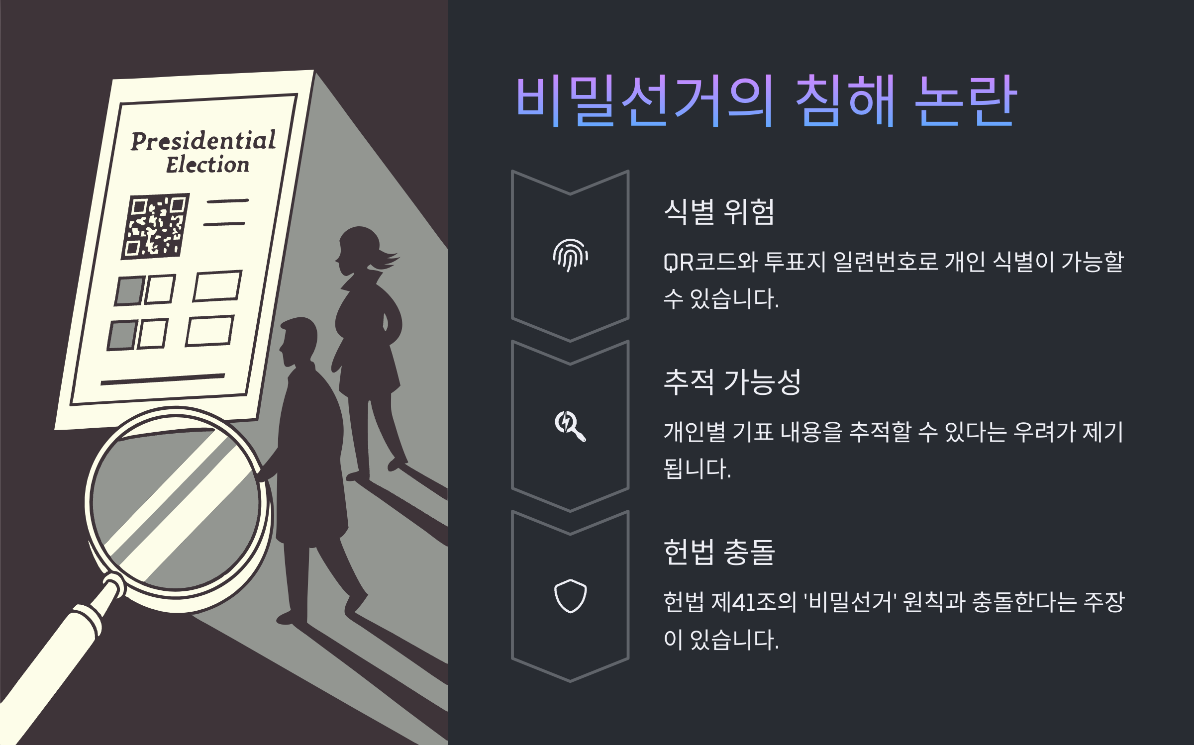 | 비밀 선거 침해 | QR 코드로 유권자 식별 가능성 제기 |
