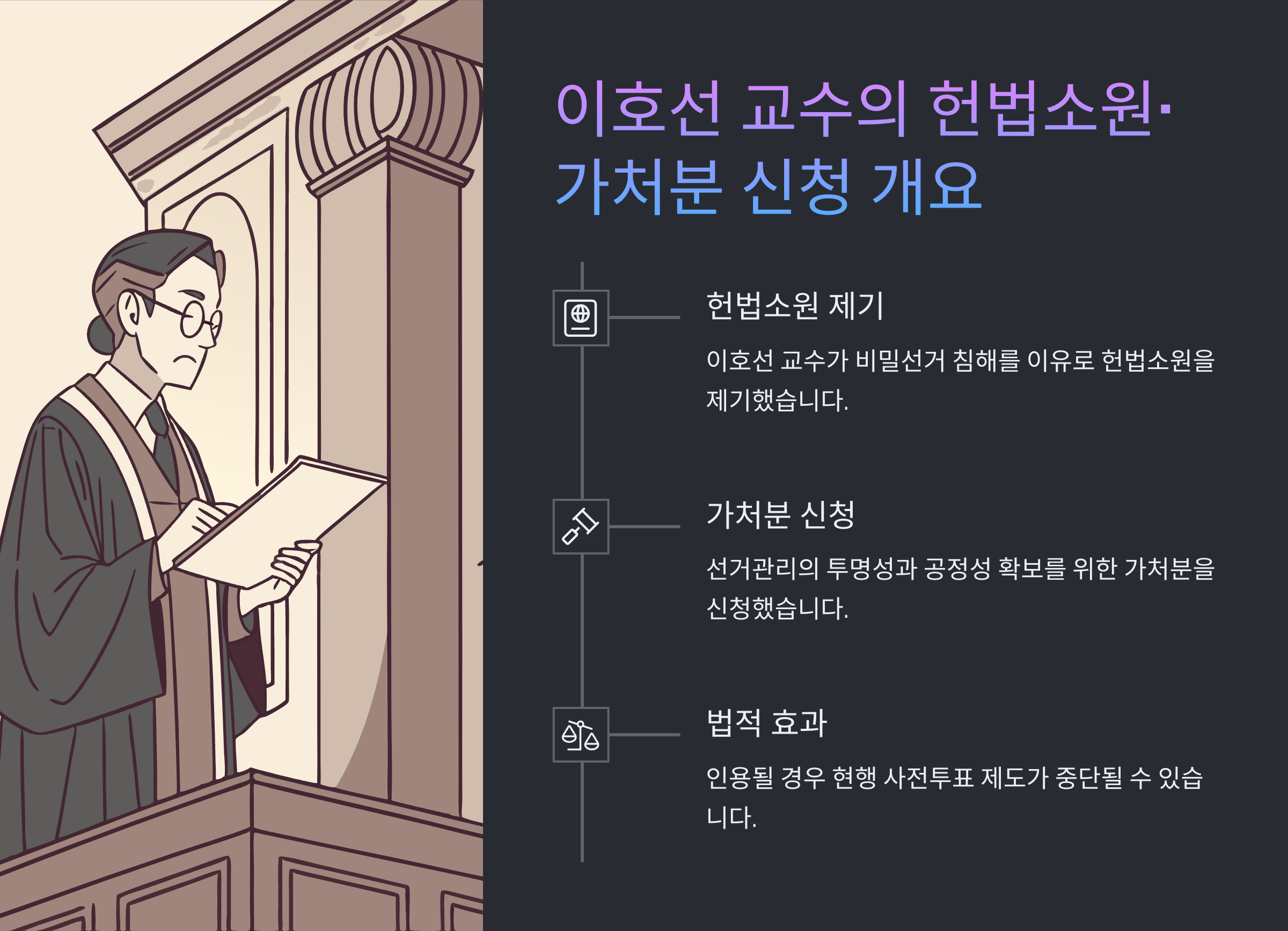 이호선 교수는 사전투표제가 헌법상 보장된 비밀선거, 평등선거, 자유선거 원칙을 침해하고 있다고 주장하며 헌법재판소에 위헌 확인을 요청했고, 선거일 이전에 가처분 결정을 내려줄 것을 신청했습니다.