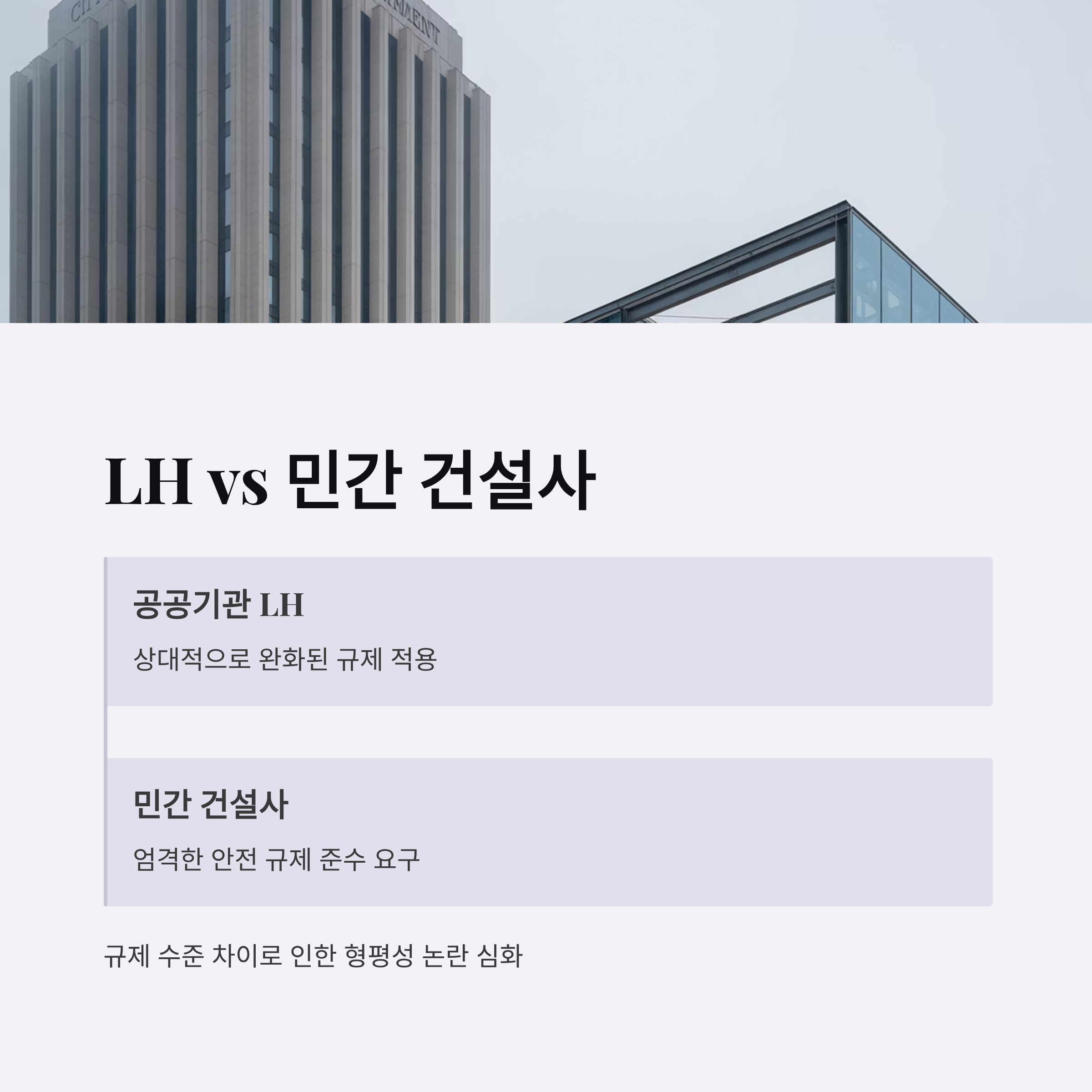 - LH와 민간 건설사 간 규제 수준 차이에 따른 형평성 논란이 불거지고 있으며, 이로 인한 갈등의 해결 방안이 필요합니다.