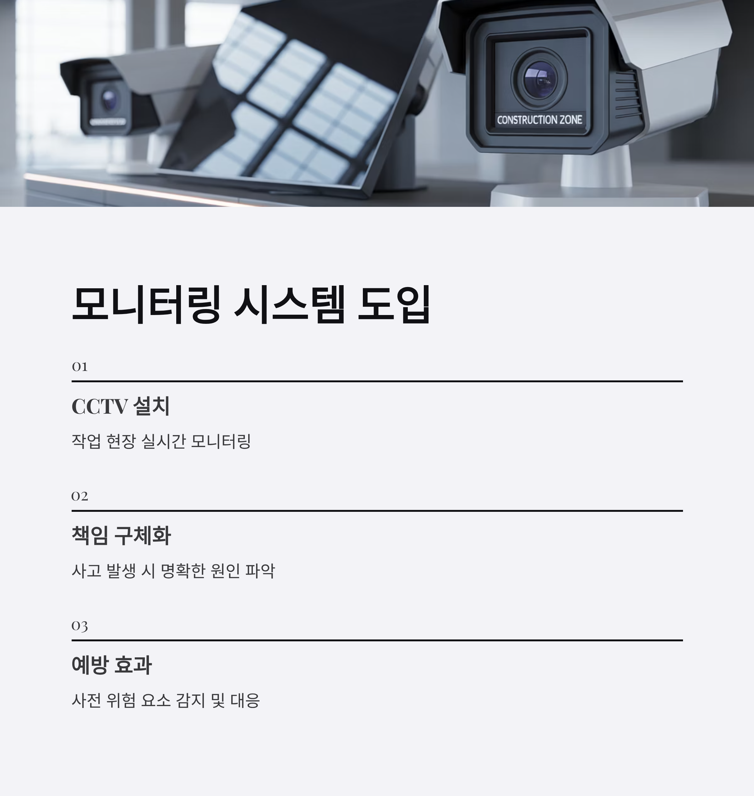 | A. 연구에 따르면, CCTV 설치와 같은 모니터링 시스템은 사고 원인 분석과 책임소재 파악에 유용합니다. 다만, 노동자들의 협조 없이 단순 감시 기능만을 강화하면 안전 효과는 제한적일 수 있습니다. |