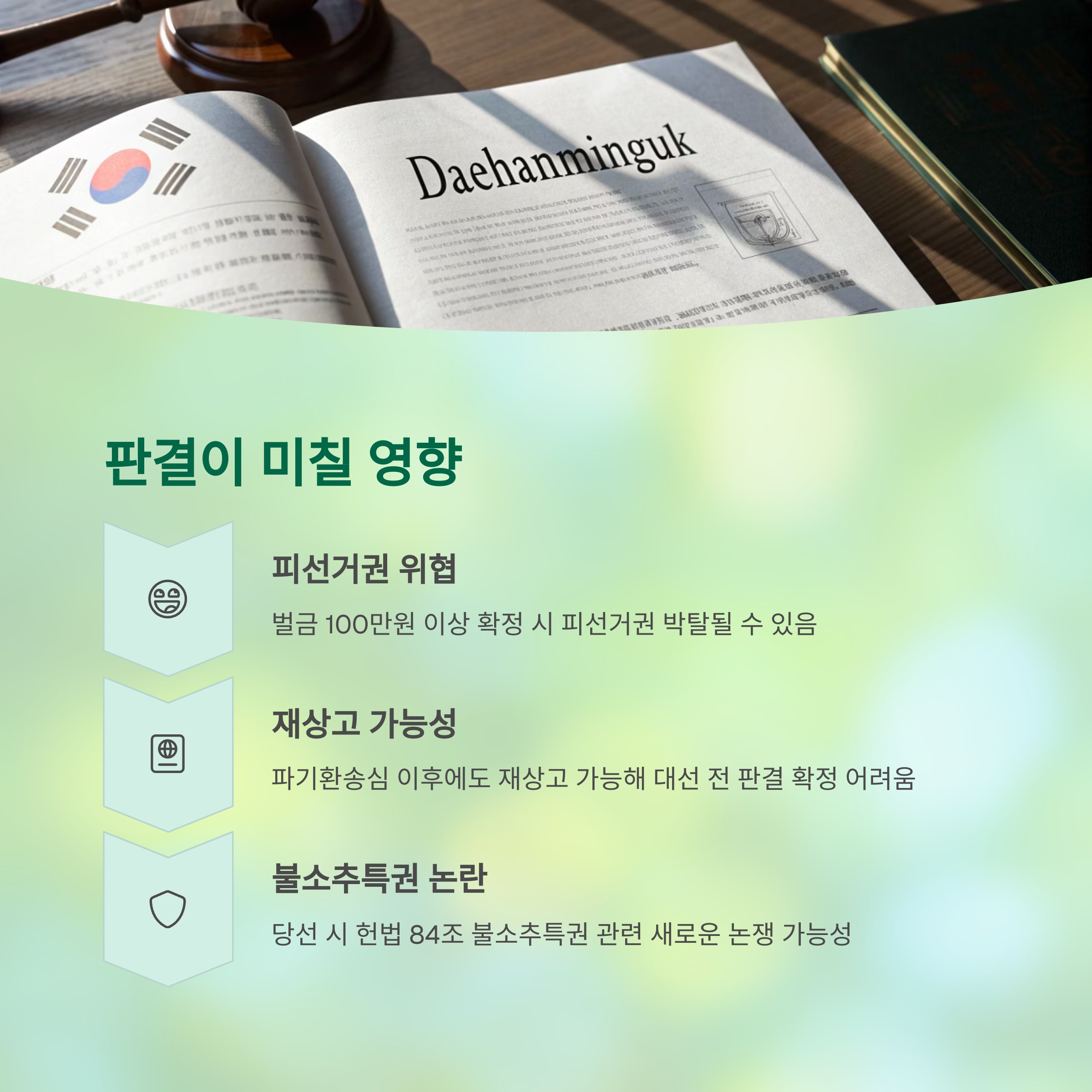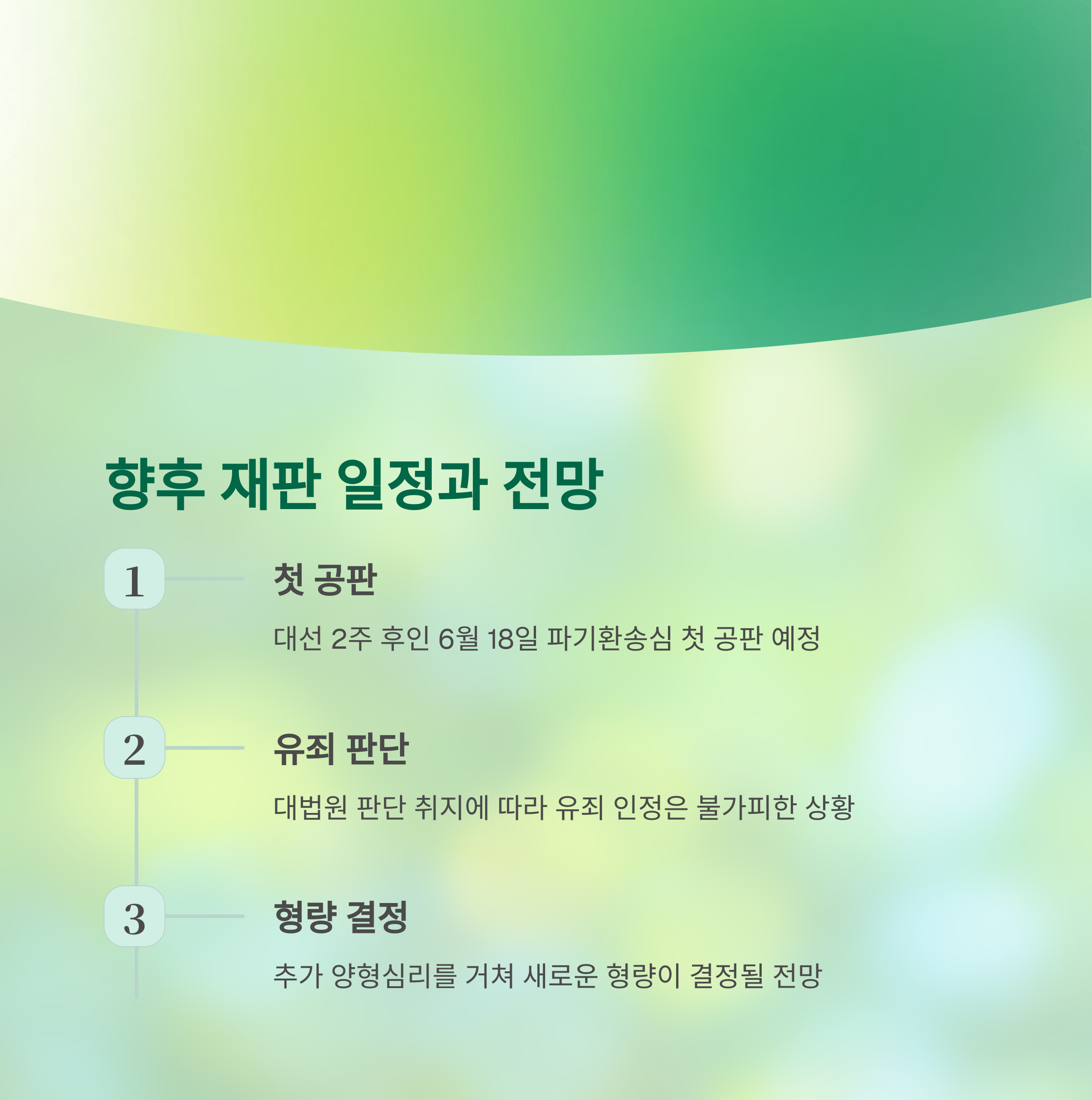 - 대선 결과에 따라 향후 재판 일정과 최종 판결에 중대한 변수가 작용할 가능성이 있음.