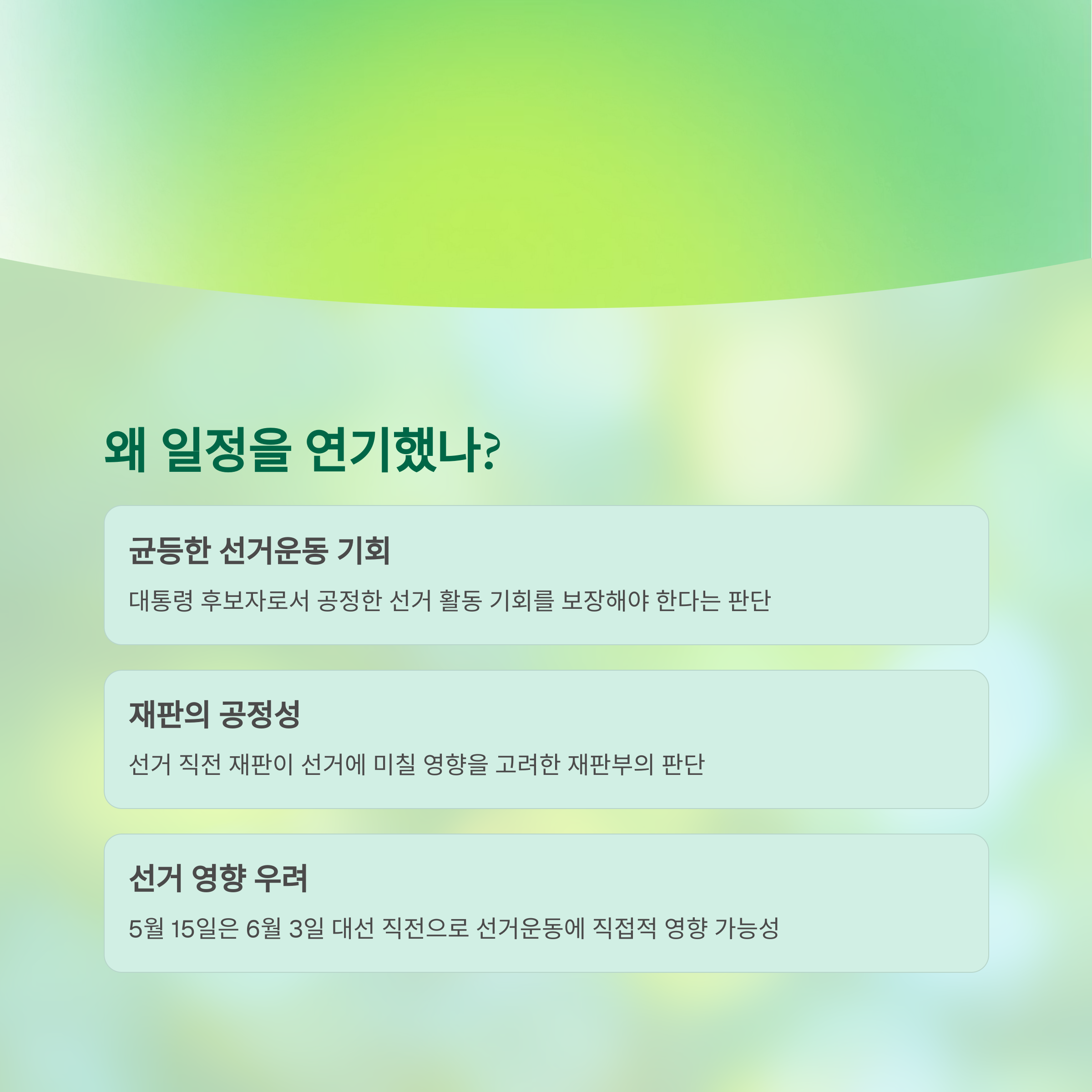 - 재판부는 "대통령 후보로서 균등한 선거운동 기회를 제공"하고 "재판의 공정성을 보장"한다는 이유를 근거로 날짜를 변경함.