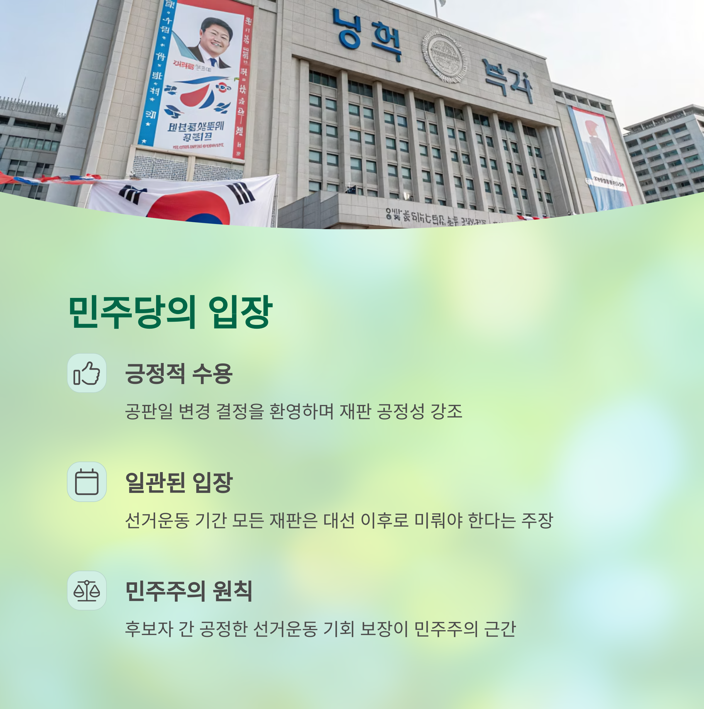 - 민주당은 공판일 변경을 긍정적으로 수용하며 공정성을 강조.