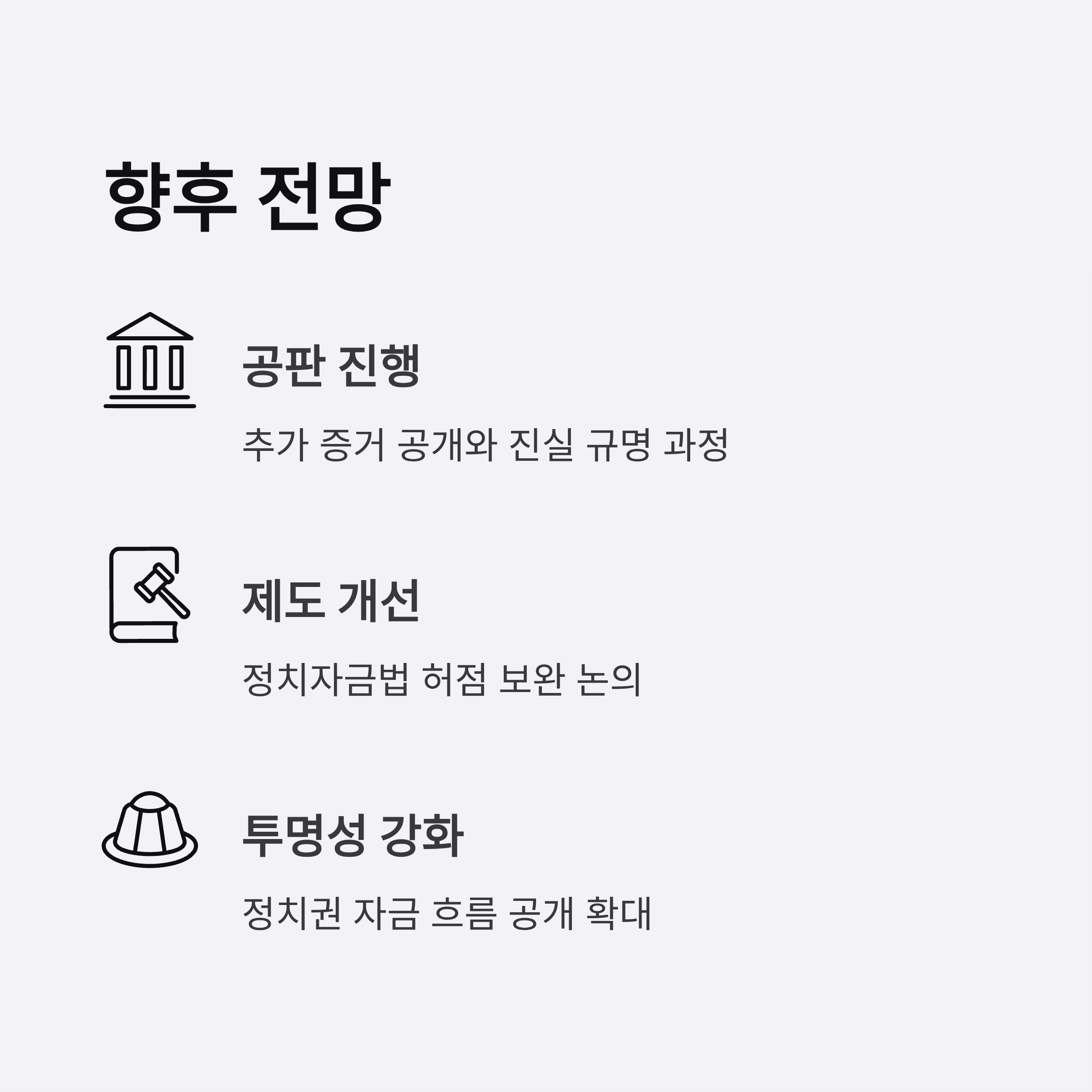 향후 사건의 진행을 통해 사법부가 불법 정치자금 문제를 어떻게 다룰지, 이를 통해 공정성과 투명성이 어디까지 보장될 수 있을지를 지켜보는 것이 중요합니다.
