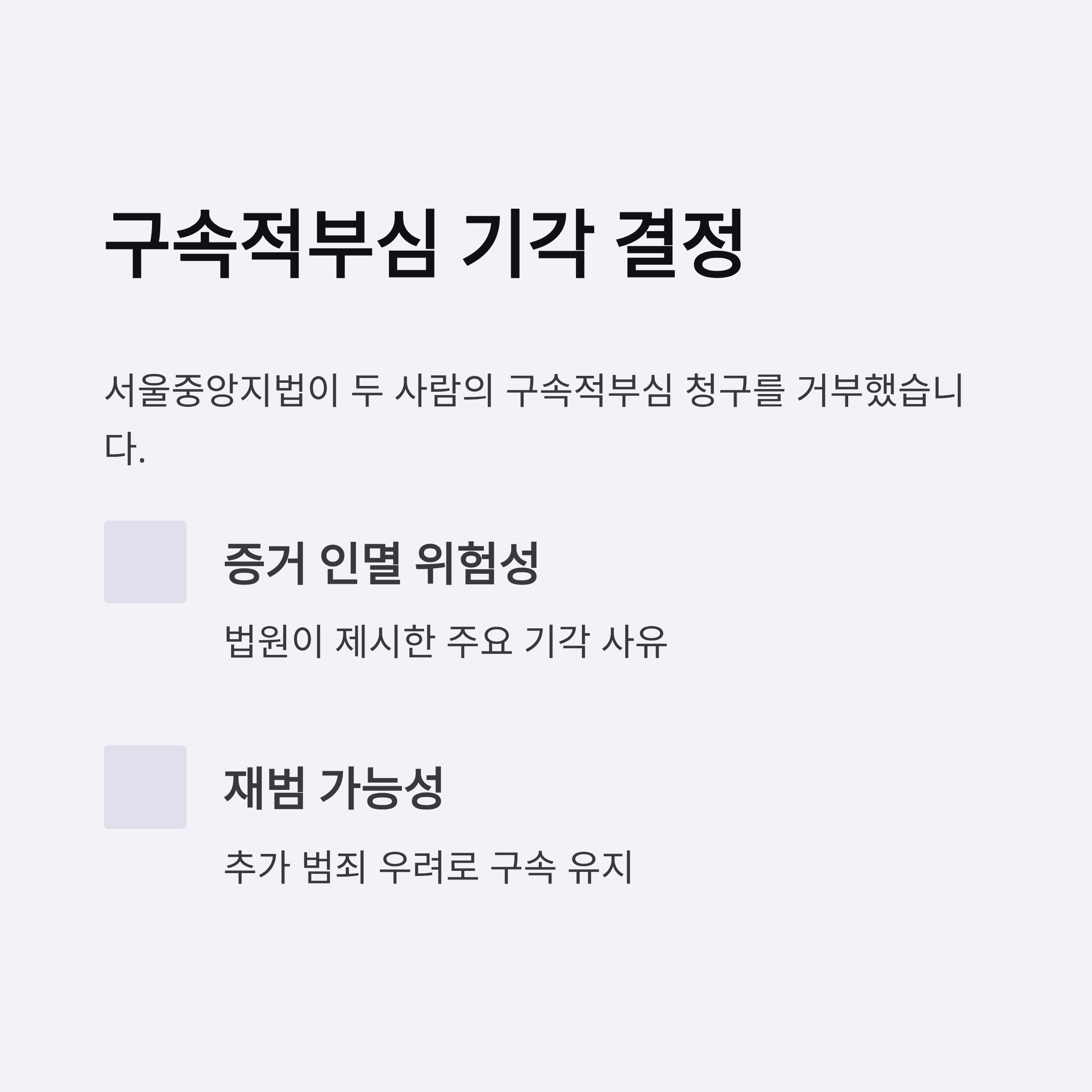 2. 서울중앙지법은 두 사람의 구속적부심 청구를 거부하며 청구 사유의 타당성이 부족하다고 판단했습니다.