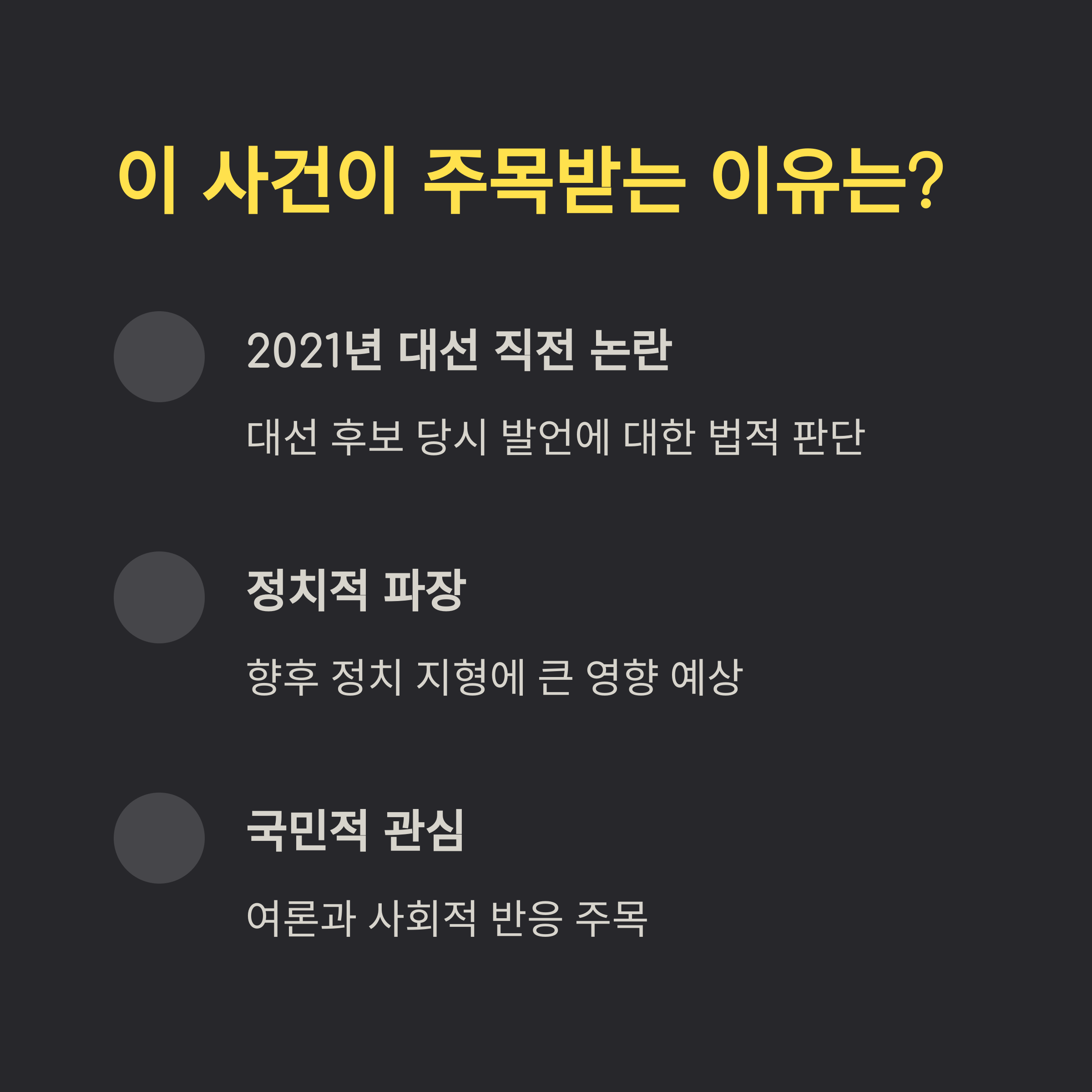 이번 사건은 단순히 한 정치인의 법적 판단을 넘어, 현재의 공직선거법 체계와 적용이 새로운 정치 현실에 얼마나 부합하는지에 대한 문제 제기입니다. 특히 개인 표현의 자유와 대중의 알 권리 사이의 균형점이 중요합니다. 향후 유사 사건을 방지하기 위해 공직선거법의 명확성 강화와 허위 사실 판단 기준의 구체화가 필요합니다.