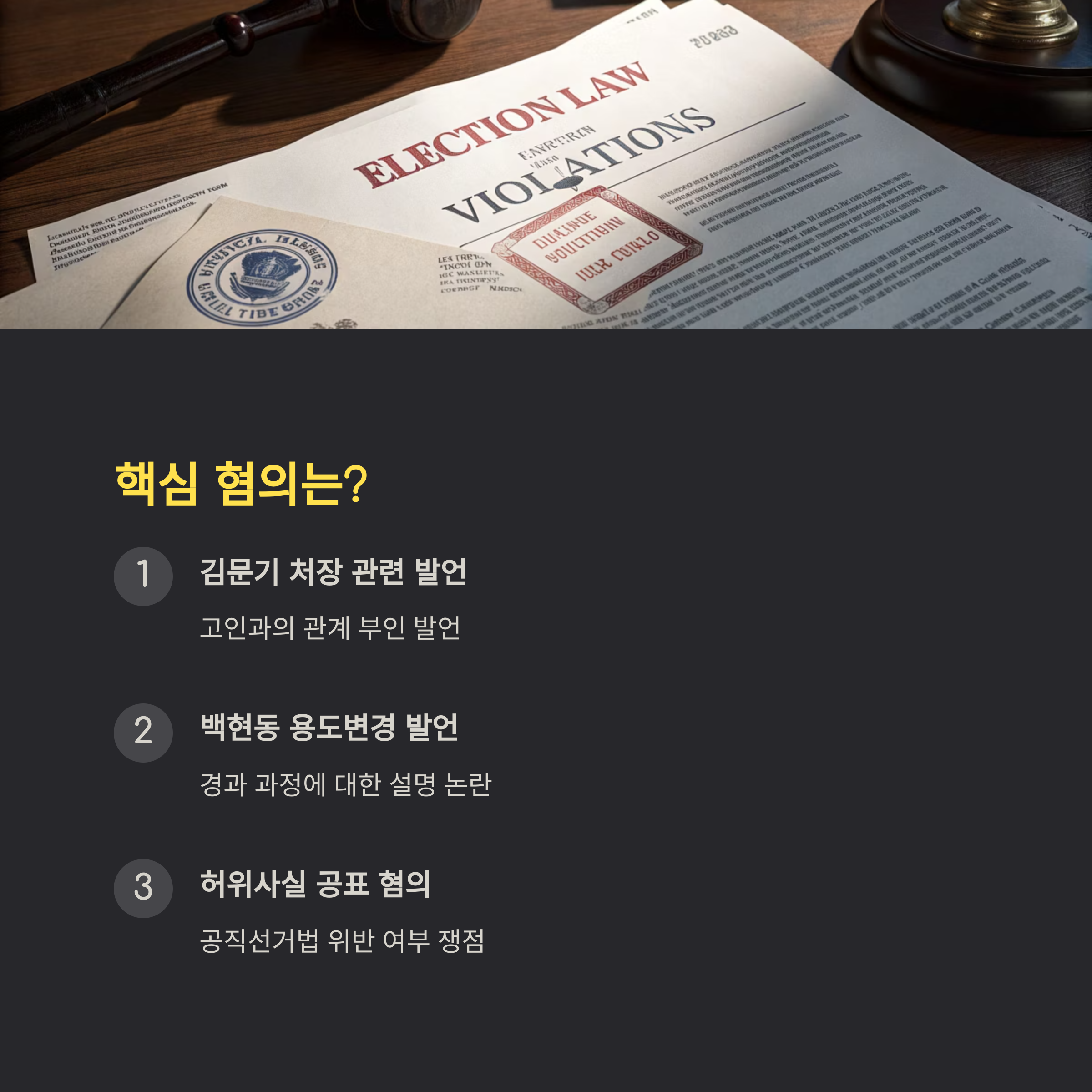 2. 사건 주요 혐의는 공직선거법상 허위사실 공표죄로, 백현동 및 김문기 관련 발언이 대상입니다.