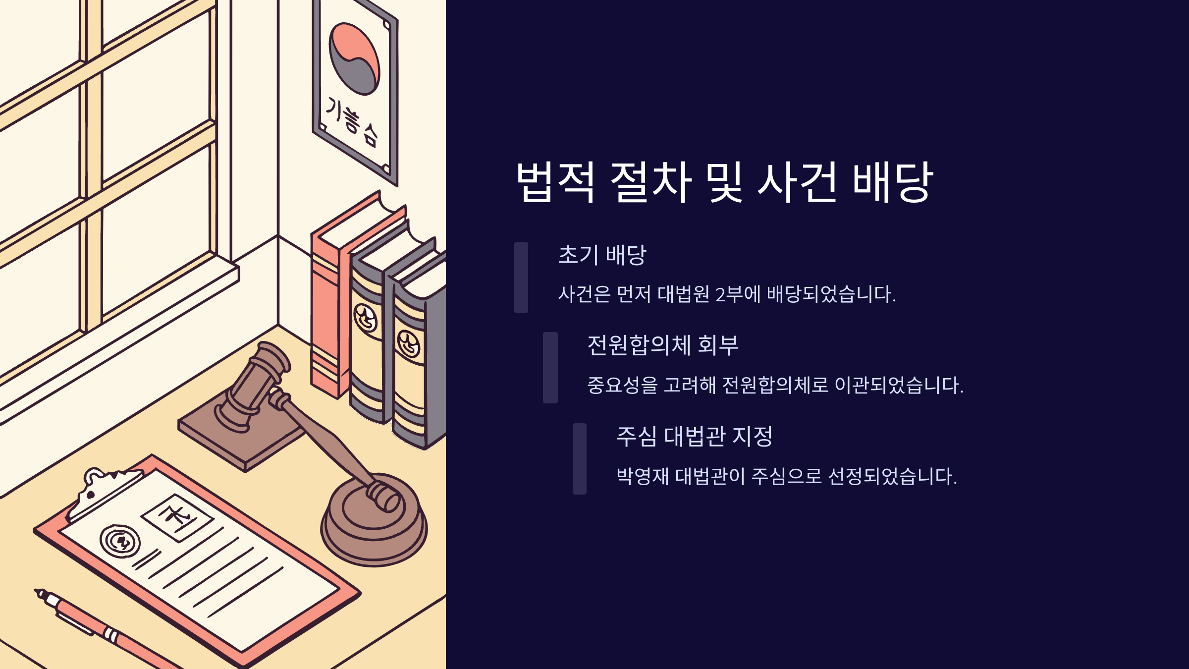 ✔️ 사건 배당: 대법원 2부에 사건 배당, 박영재 대법관이 주심으로 선정됨.