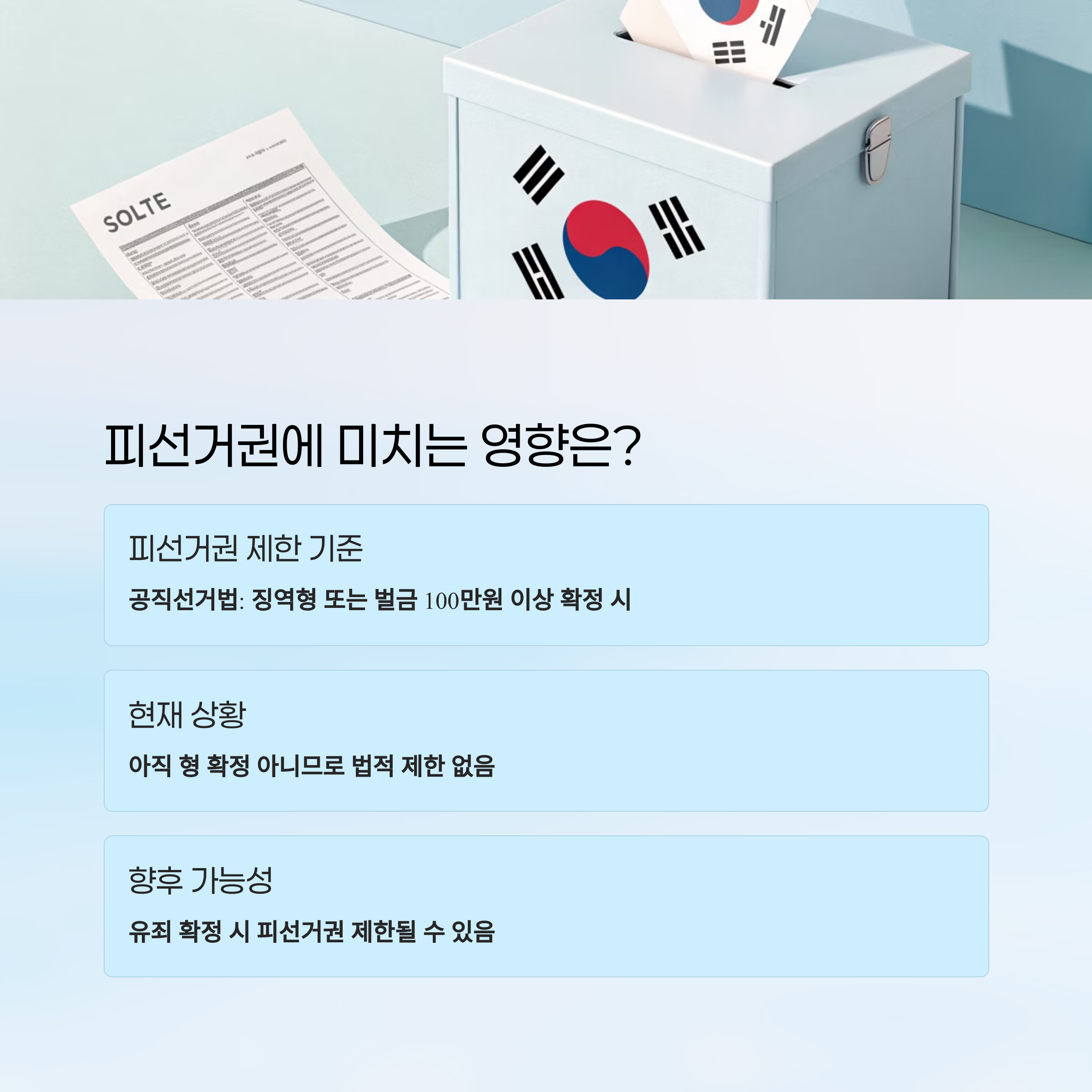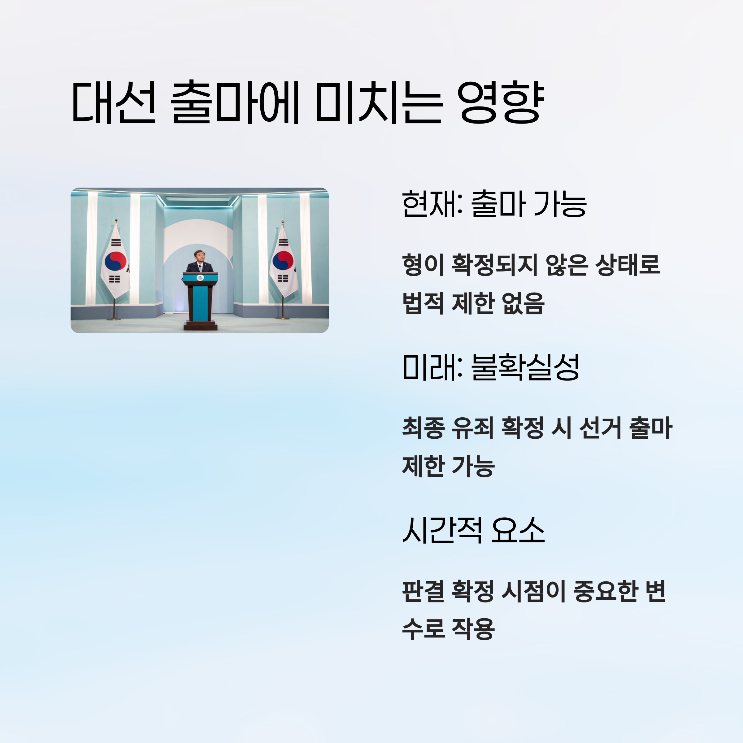 - 현재 상태: 아직 형이 확정되지 않아 대선 출마에는 법적 제약 없음