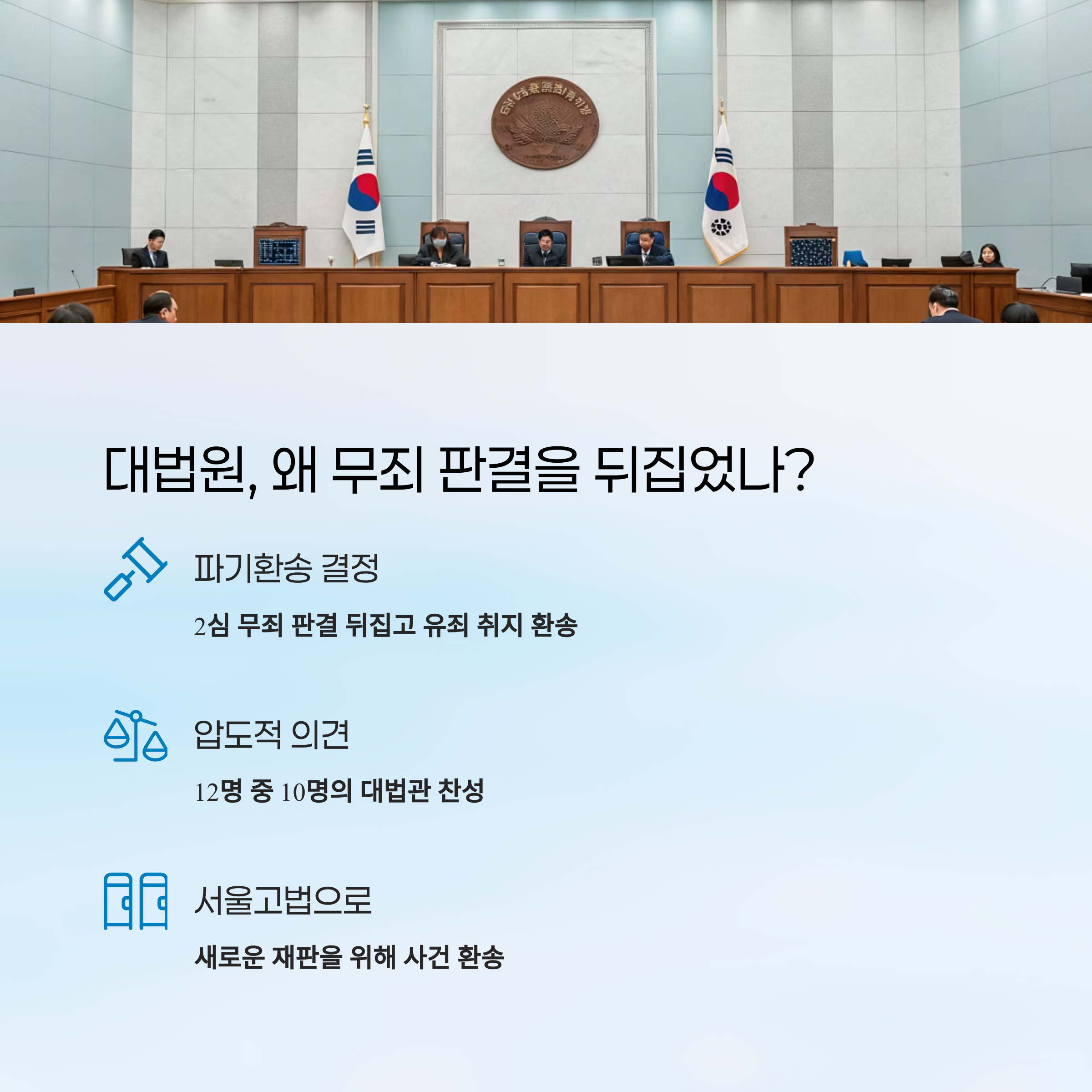 대법원이 이재명 대표 사건을 유죄 취지로 파기환송했다는 것은, 기존 무죄 판결에 대해 법리적 문제가 있다는 판단을 내린 것입니다. 특히 허위사실 공표 혐의와 관련된 공직선거법 위반 판단에 있어서 ‘유권자의 판단을 왜곡할 가능성이 충분한 발언’이라는 해석을 통해 대법원은 정치인의 발언에 보다 엄격한 기준을 적용했습니다.