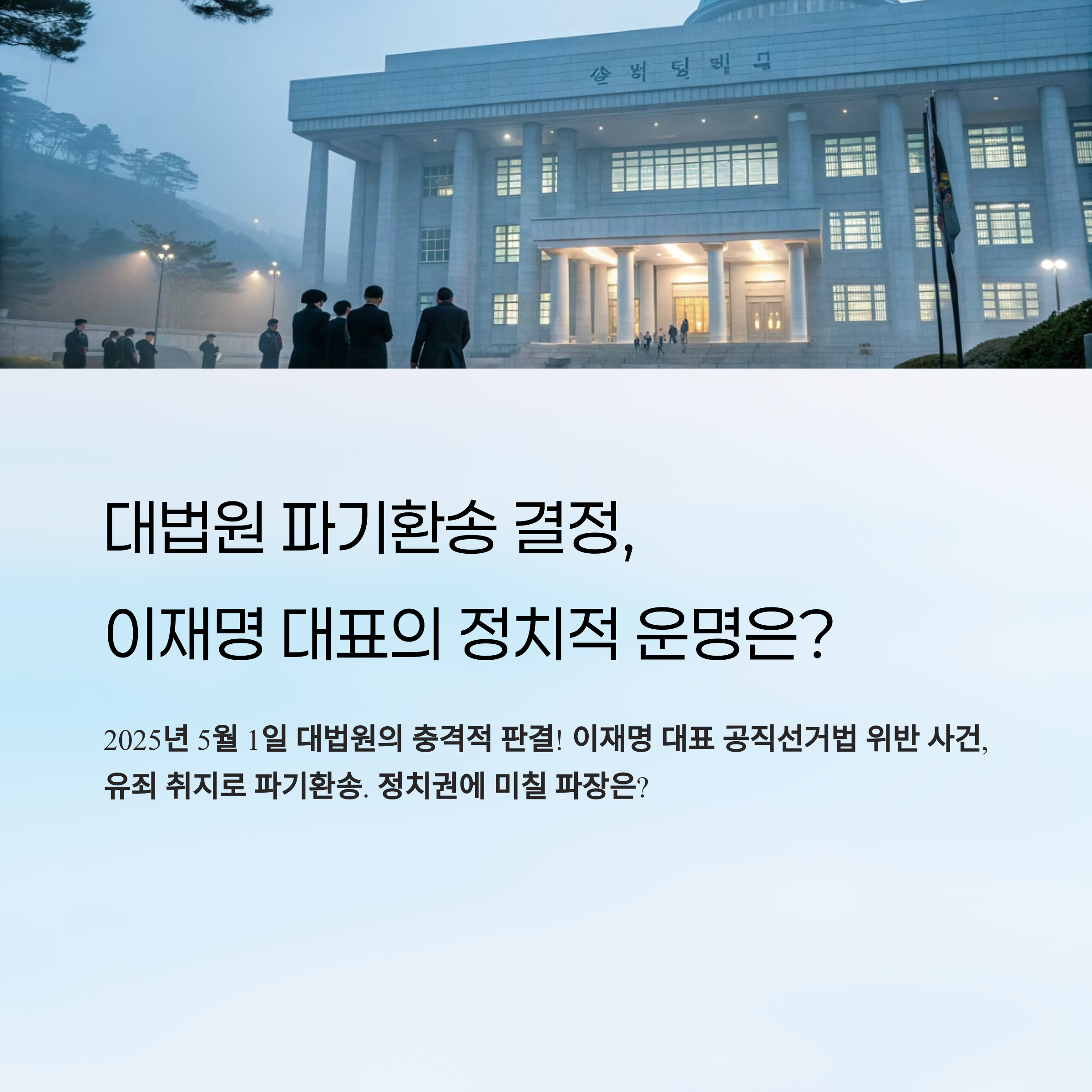 2025년 5월 1일, 대법원 전원합의체는 이재명 더불어민주당 대표에 대한 공직선거법 위반 사건에서 유죄 취지의 파기환송 결정을 내렸습니다. 이는 하급심 판결을 뒤집고 사건을 서울고등법원으로 돌려보낸다는 의미로, 정치권에 큰 파장을 일으키고 있습니다.