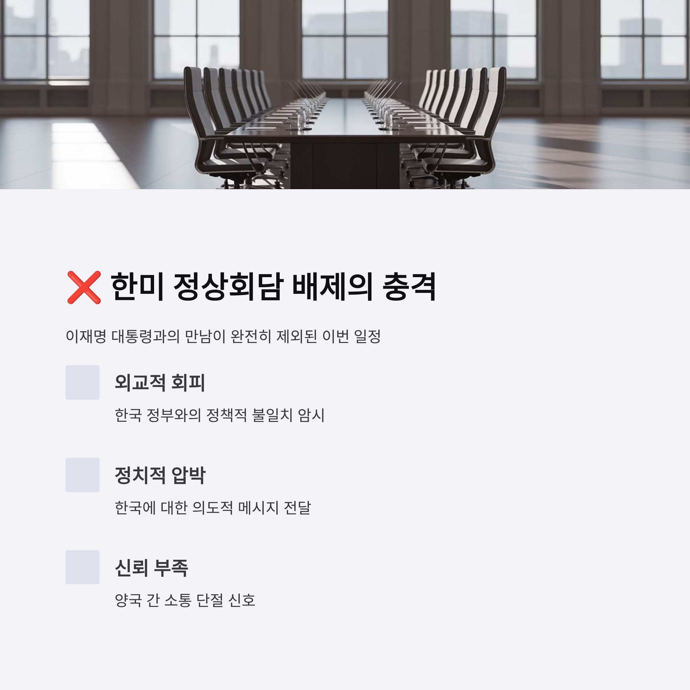- 한미 정상회담 불투명 및 이재명 대통령 배제