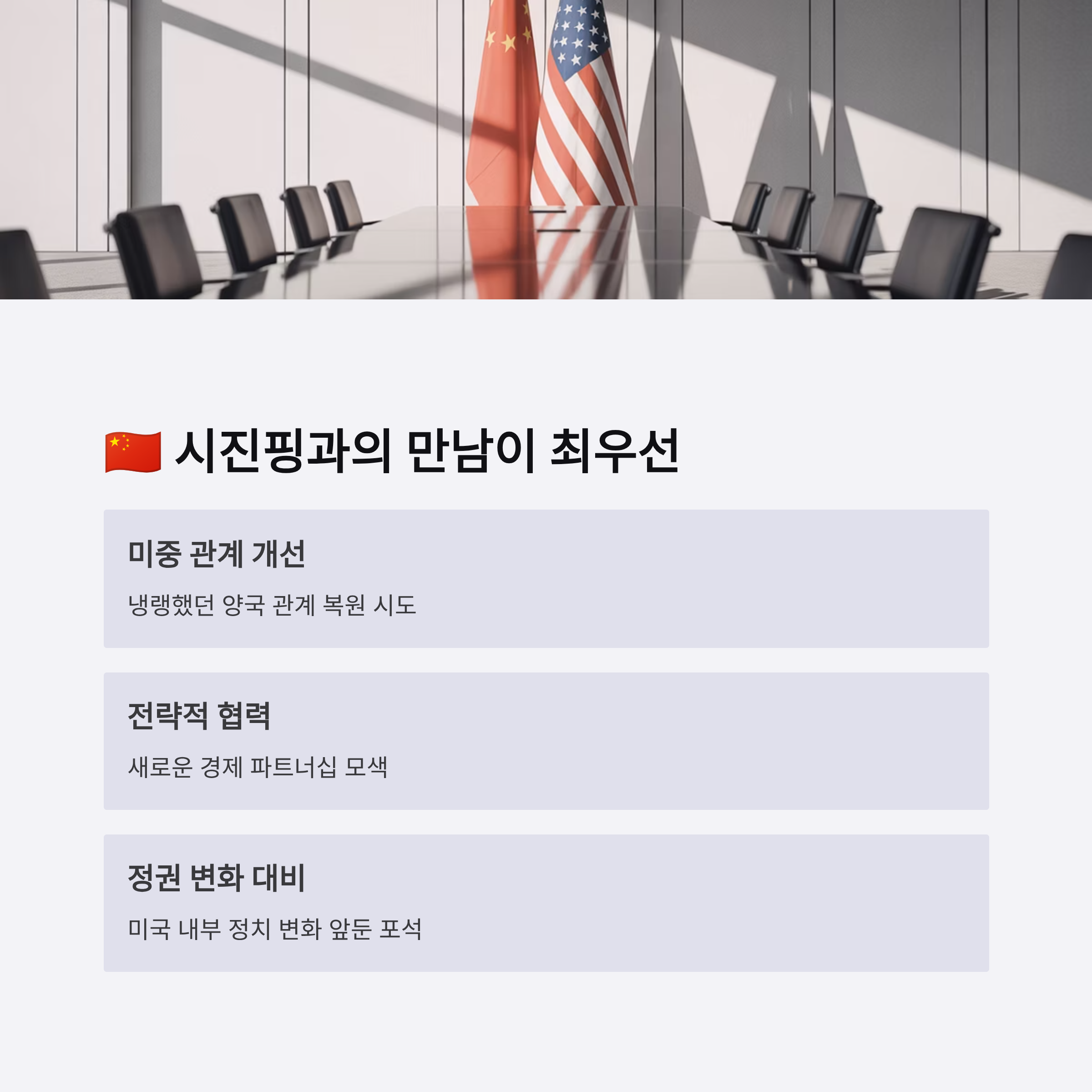 트럼프의 한국 방문 일정에서 가장 두드러지는 특징은 시진핑 주석과의 만남입니다. 이는 트럼프 전 대통령이 미중 관계를 중재하거나, 향후 미국과 중국 간 협력의 새로운 가능성을 타진하려는 의도로 해석됩니다. 특히, 미국 내부의 정권 변화를 앞둔 시점에서 그동안 냉랭했던 미중 관계를 개선하려는 전략적 시도로 볼 수 있습니다. 하지만 이는 한국의 외교적 입지를 축소시키는 결과를 낳을 수 있다는 점에서 논란의 여지가 큽니다.