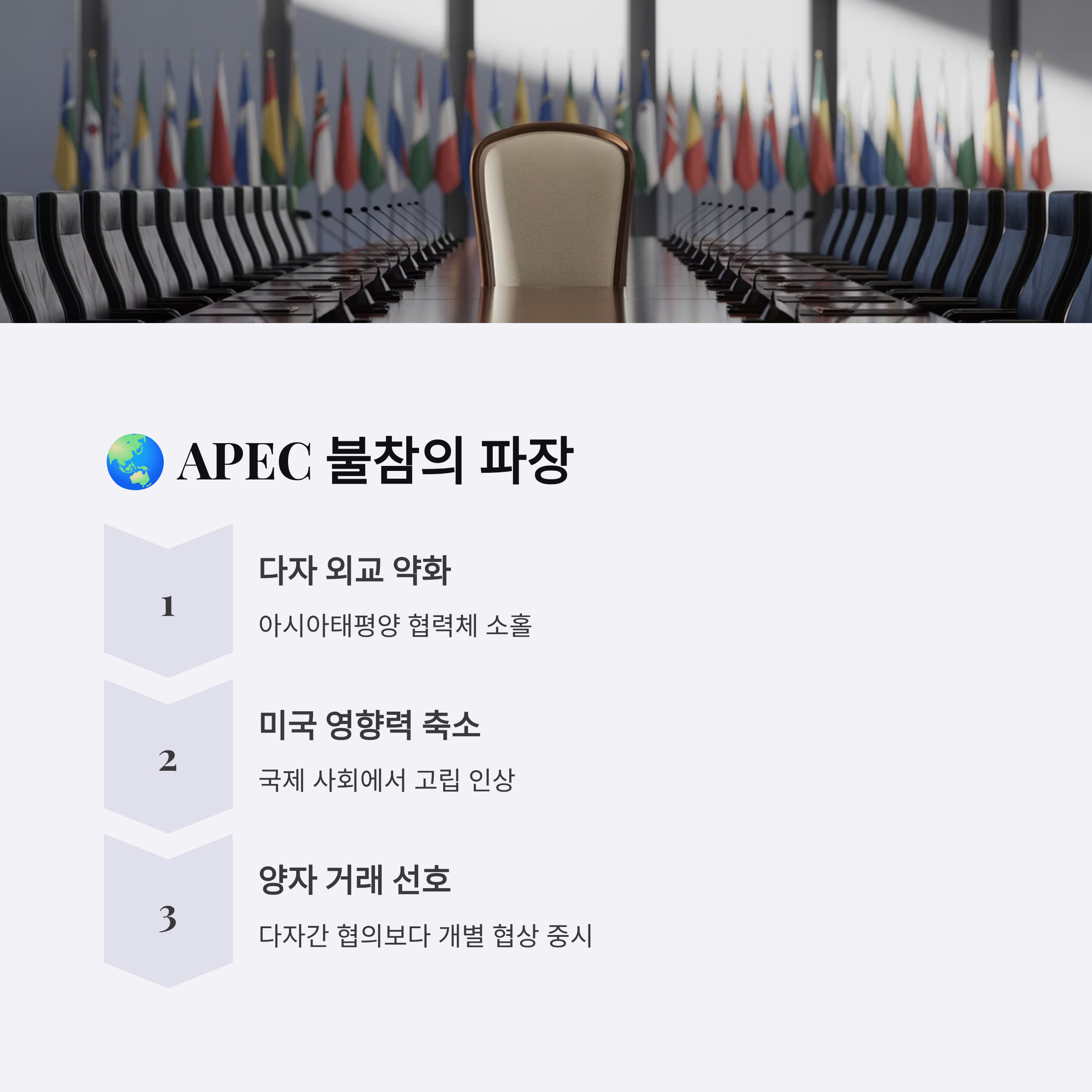 트럼프의 APEC 회담 불참 결정은 한국을 포함한 아시아 국가들에 외교적 긴장감을 높이는 주요 요인으로 작용할 수 있습니다. APEC은 아시아태평양 지역의 주요 경제 및 외교적 협의의 장인데, 미국 전 대통령의 불참은 국제 사회에서 미국의 영향력이 약화되고 있음과 동시에 아시아 국가와의 조율이 부족하다는 인상을 줄 수 있습니다. 특히, 이는 다른 회원국에게 미국 주도의 다자 협력이 점차 고립되고 있다는 메시지를 전달할 가능성이 큽니다.