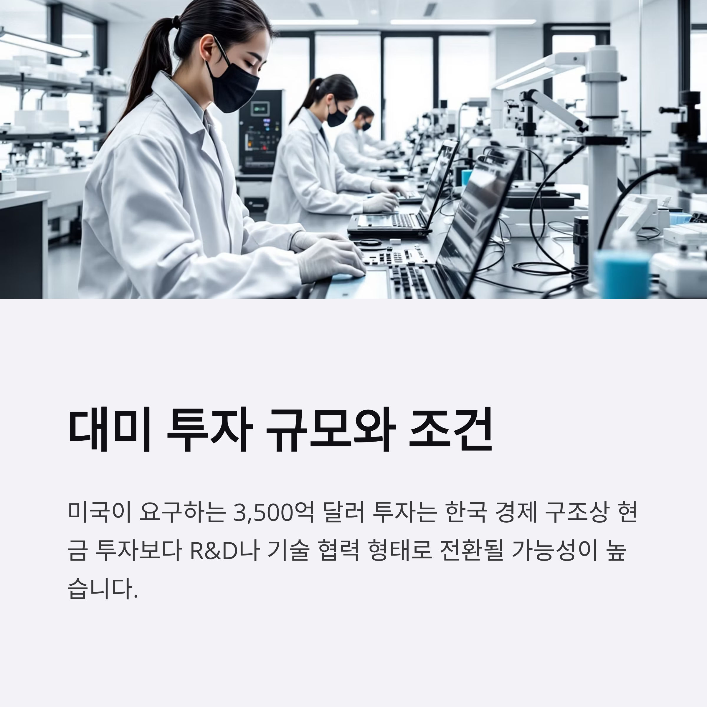 미국은 한국이 대미 투자 조건으로 제시한 3,500억 달러라는 금액을 계속 요구하고 있습니다. 그러나 한국 경제 구조상 현금 투자보다는 연구·개발(R&D)이나 기술 협력 형태의 투자로 전환될 가능성이 높습니다. 이를 통해 양국은 단기적 이익뿐만 아니라 장기적 윈윈 구조를 구축할 수 있을 것입니다.