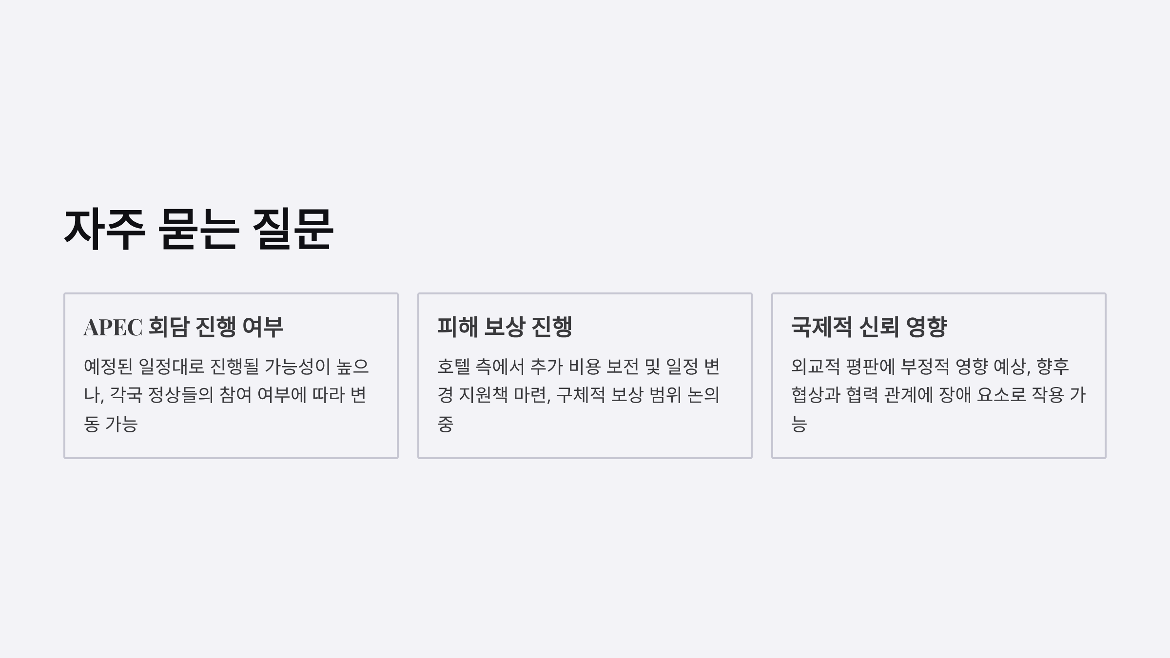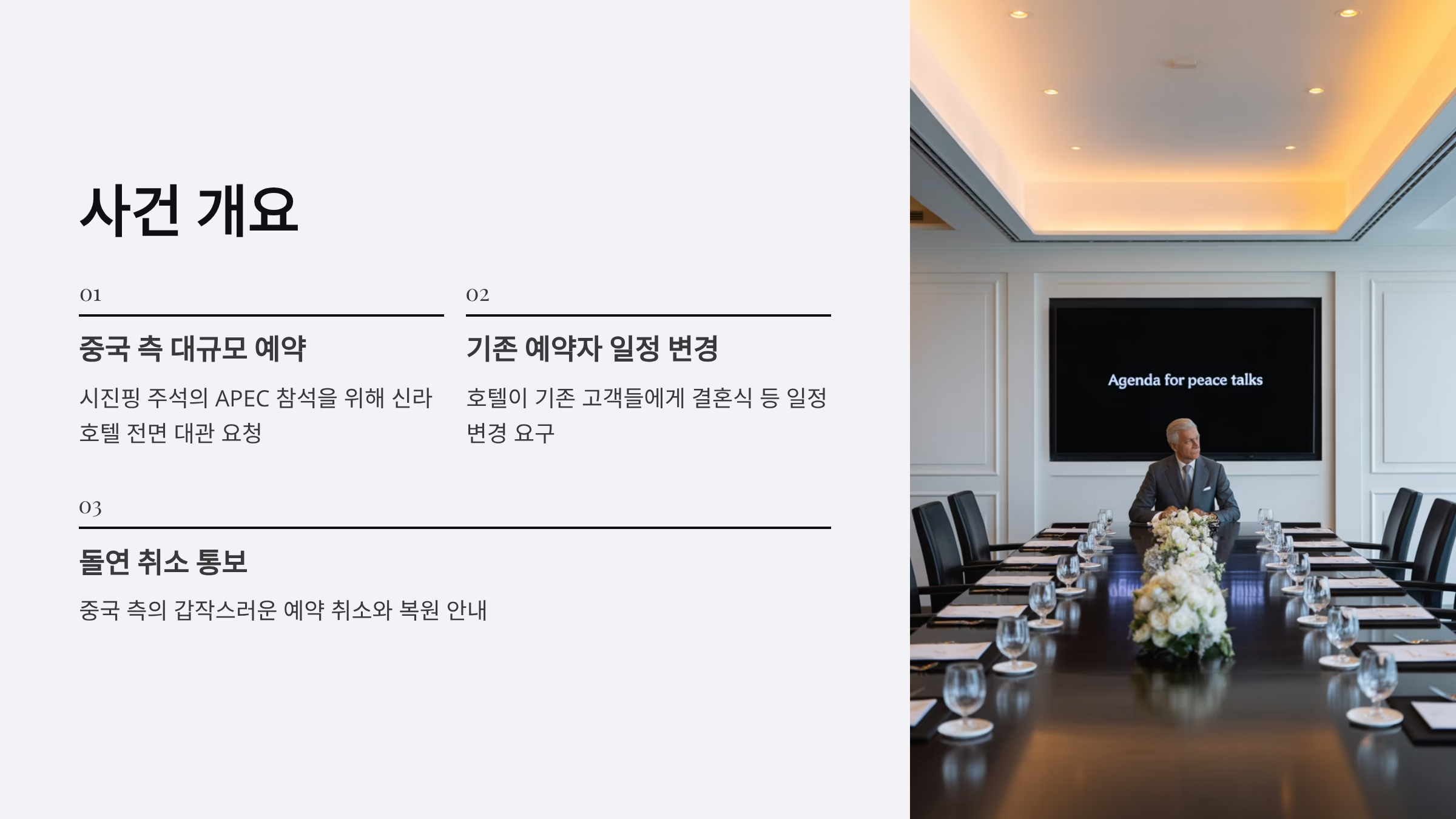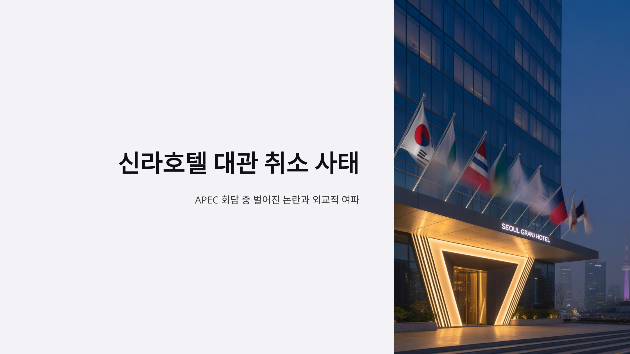신라호텔 대관 사태는 APEC 정상 회담이라는 세계적 외교 행사의 준비 과정에서 발생했습니다. APEC 정상 회담은 참여국 간의 경제 협력을 논의하고 전략적 합의를 도출하는 자리로, 국가의 이미지를 직접적으로 반영합니다. 그러나 이번 신라호텔 사태는 중국 측의 갑작스러운 일정 변경과 더불어 각국 간 협력 부족을 드러내며 혼란을 초래했습니다. 특히 국빈급 예약 변경은 협의 부족으로 인해 예상치 못한 피해를 국내 소비자들에게 전가한 사건으로 기록될 가능성이 큽니다.