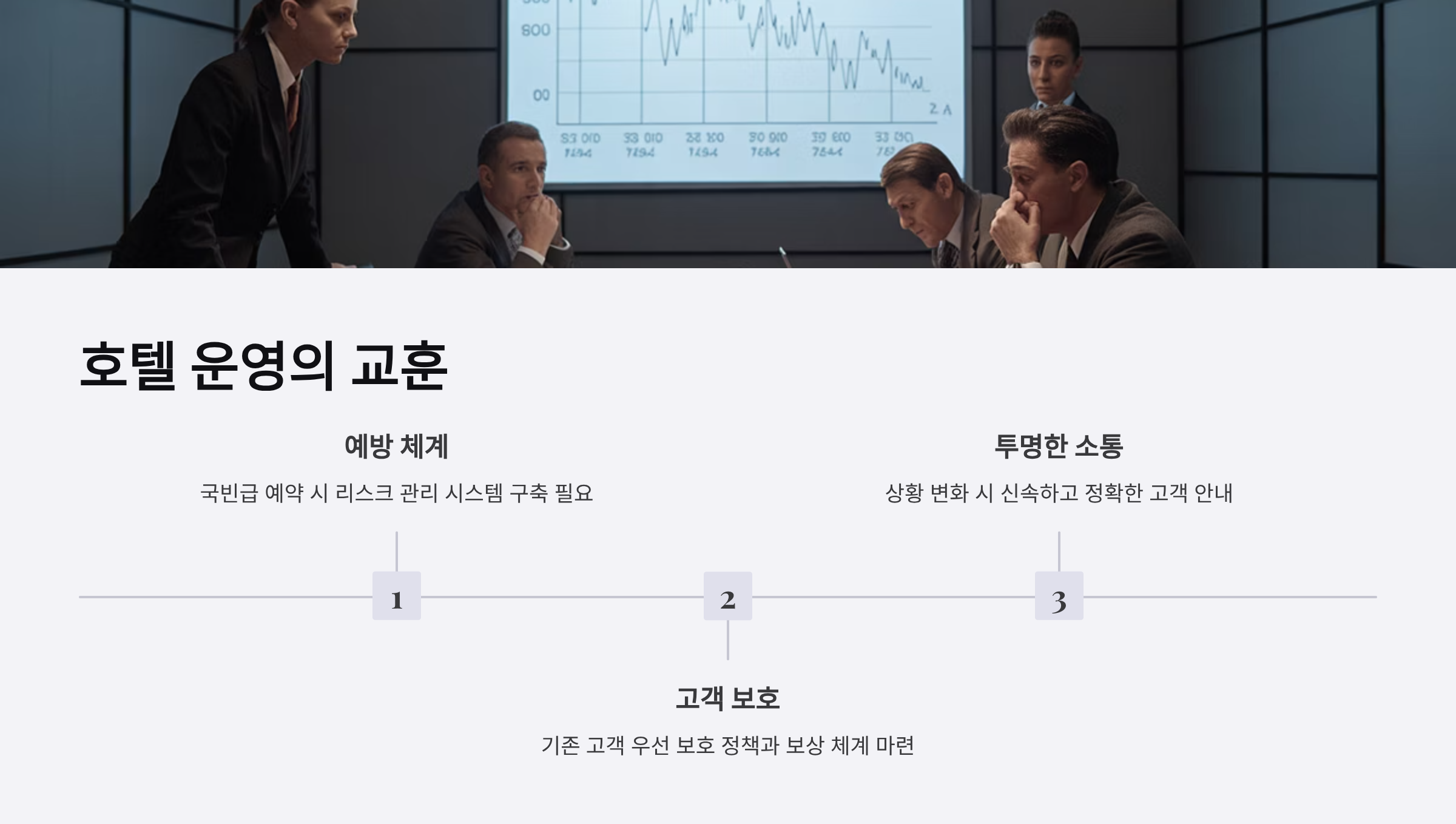 2. 호텔은 기존 예약자들의 일정을 변경하도록 했으나, 취소 후 바로 복원 안내, 고객 신뢰 저하.