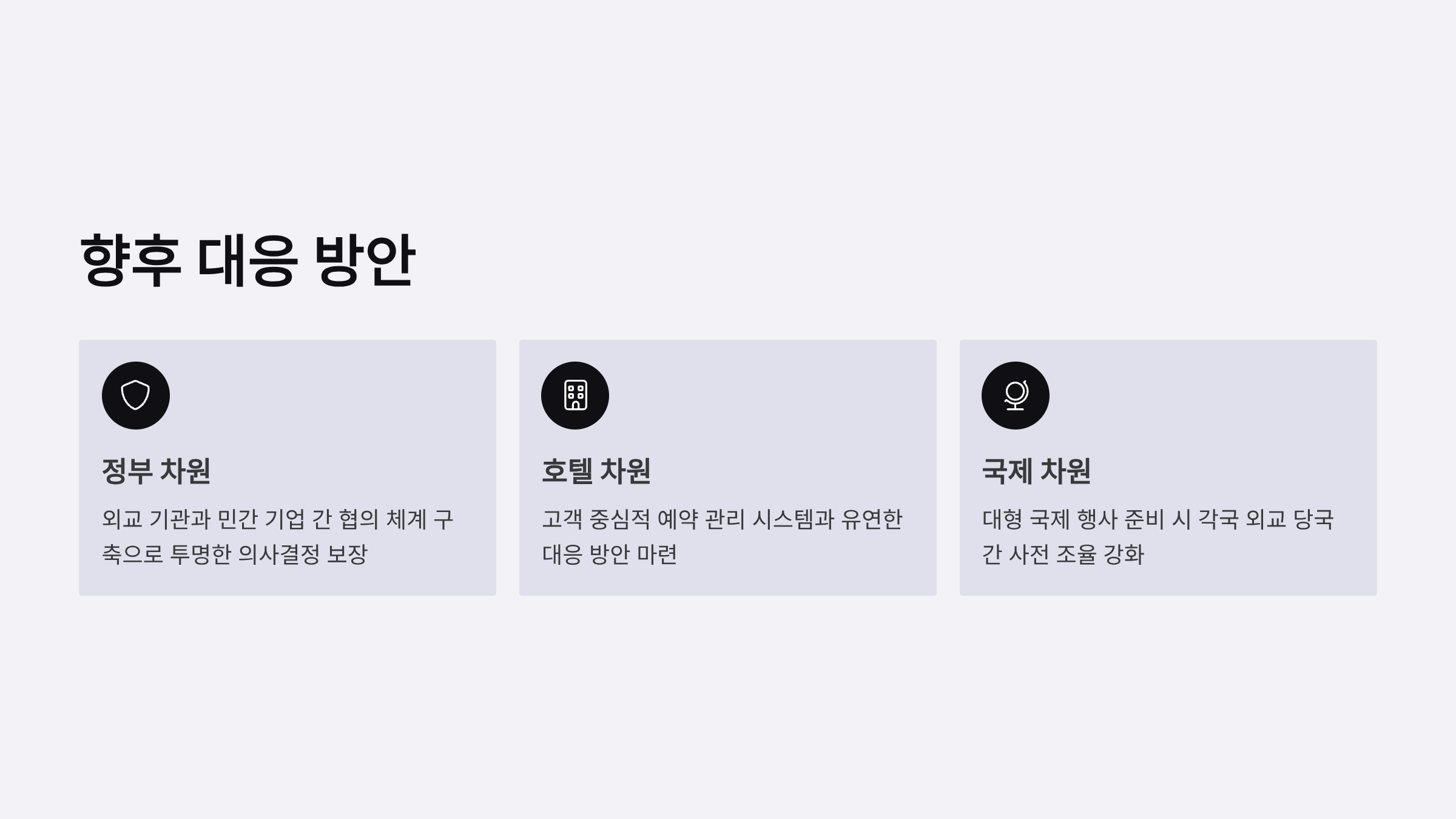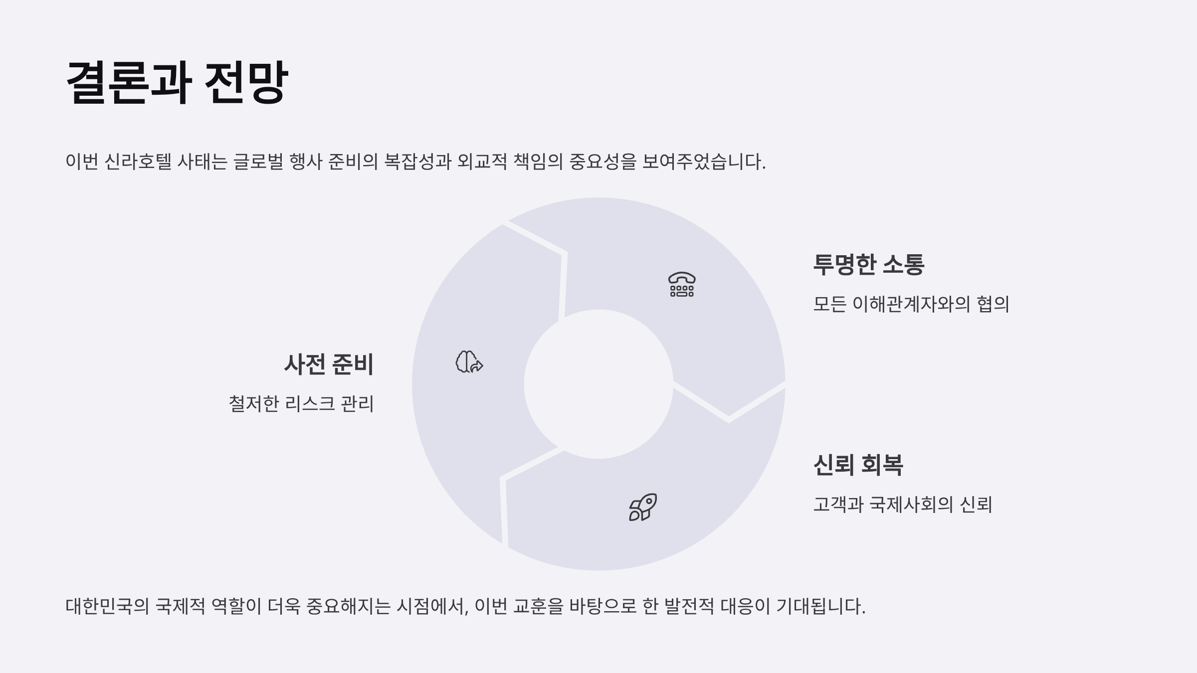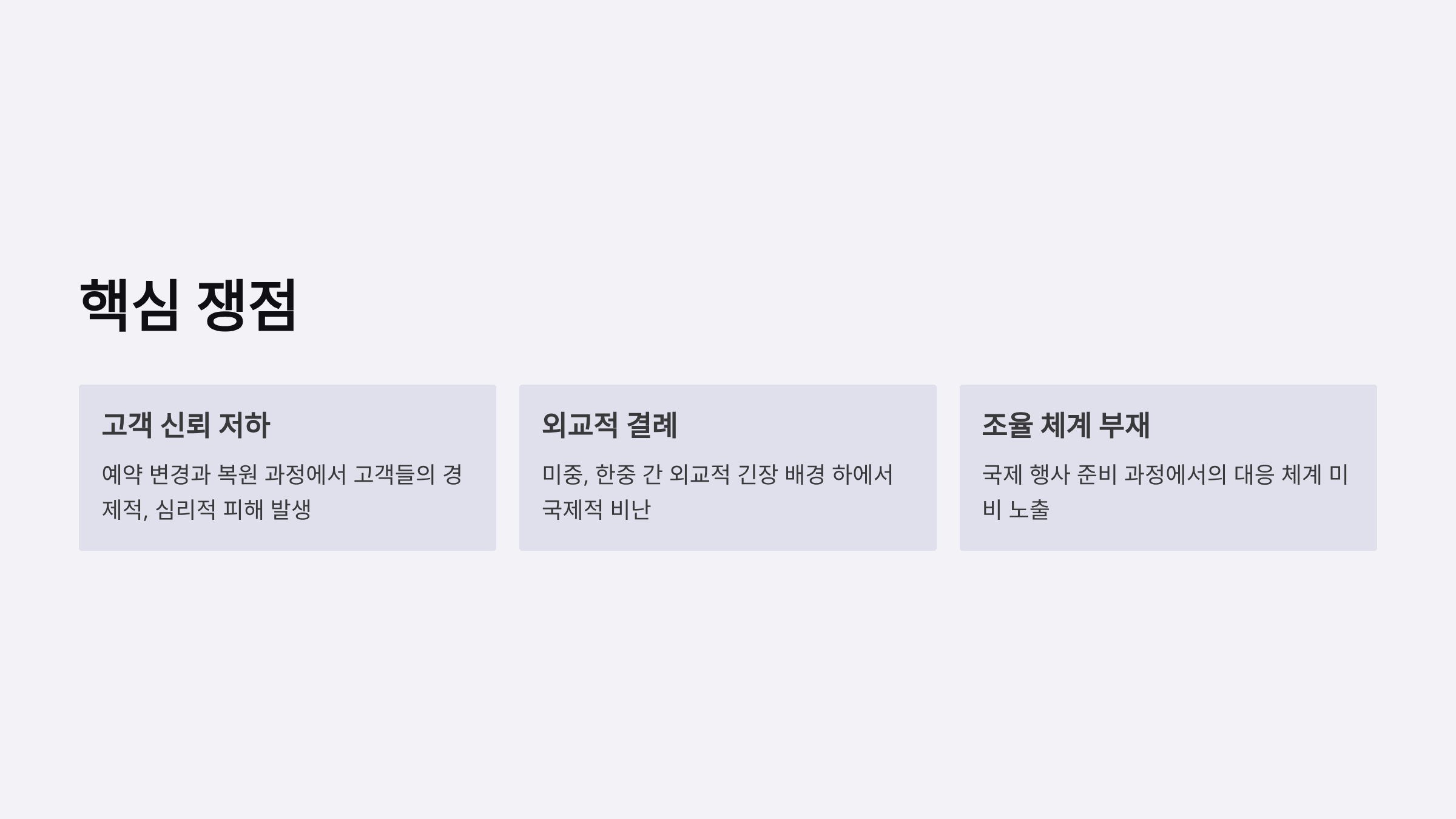 5. 이번 사태는 국제 행사 준비 과정에서의 조율 및 대응 체계 부재를 보여주는 사례로 평가됨.