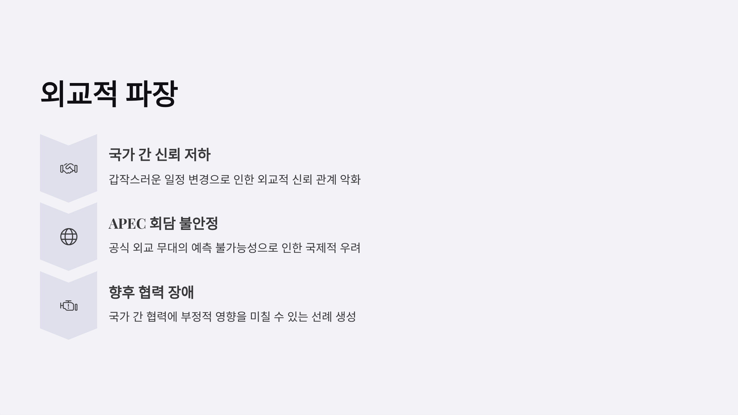 중국의 갑작스러운 일정 변경과 관련된 사안은 단순 호텔 예약 문제를 넘어 외교적 결례로 확대되었습니다. 시진핑 주석의 일정 변경 및 APEC 참석 불확실성은 중국, 미국, 한국 간 외교적 긴장 요소로 자리 잡았습니다. 이와 같은 방식은 국가 간 신뢰를 저하하고, APEC 회담이라는 공식 무대를 불안정하게 만드는 결과를 초래할 뿐만 아니라, 향후 국가 간의 협력에도 장애물이 될 수 있다는 우려를 낳고 있습니다.