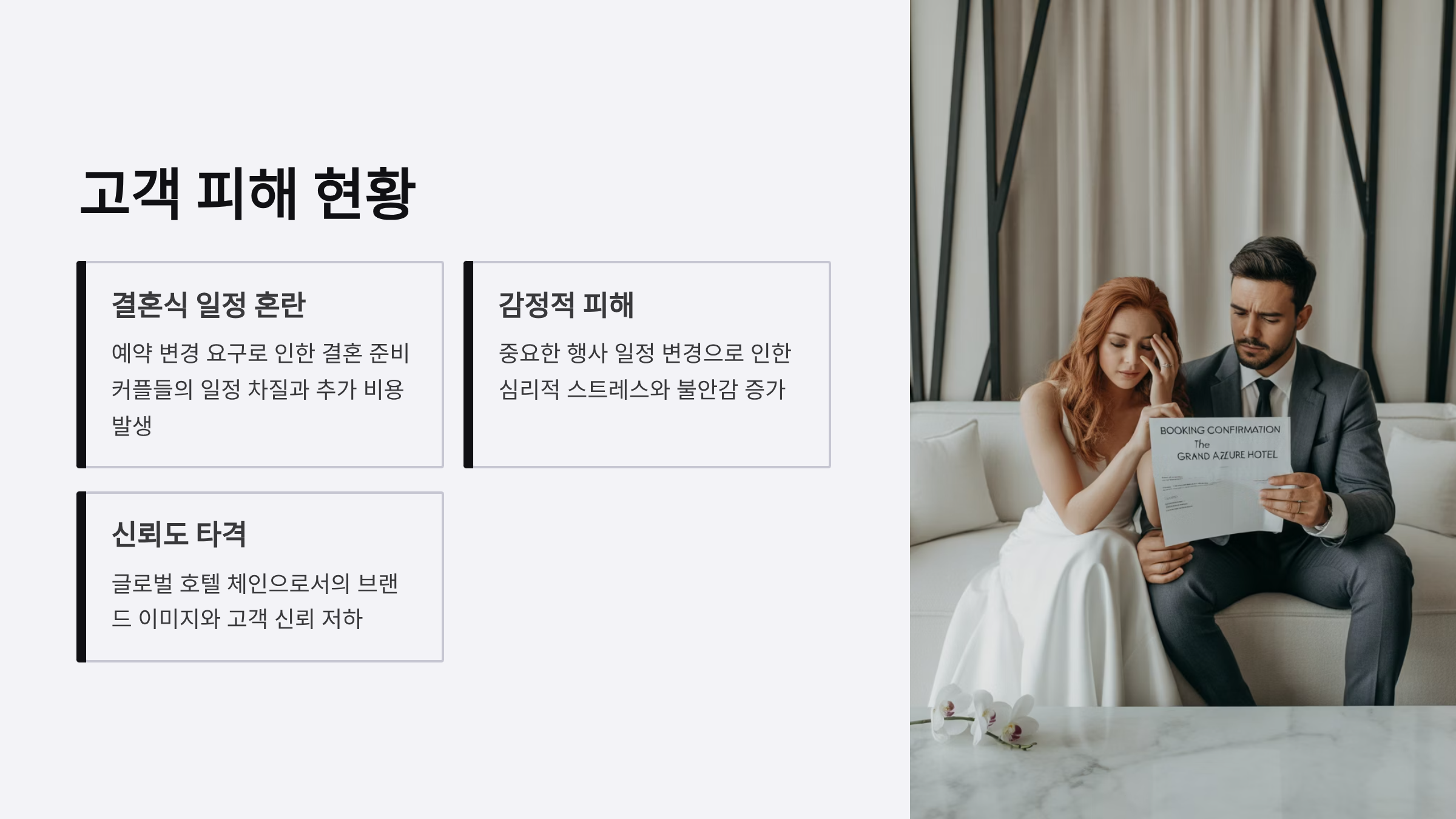 호텔 운영 측면에서 이번 사태는 고객 신뢰도에 중대한 영향을 미쳤습니다. 신라호텔은 중국 측 요청으로 예약된 일정에 따라 기존 고객들에게 결혼식 일정 변경을 요구했으나, 이후 취소와 복원 과정에서 고객들은 심각한 손해를 입었습니다. 이러한 불확실성은 추가 비용 발생과 일정 혼란을 초래했고, 특히 결혼식을 준비하던 이들에게는 금전적인 피해뿐만 아니라, 감정적인 불만까지 유발했습니다. 이는 글로벌 호텔 체인으로서의 이미지 타격으로 이어질 가능성이 높습니다.