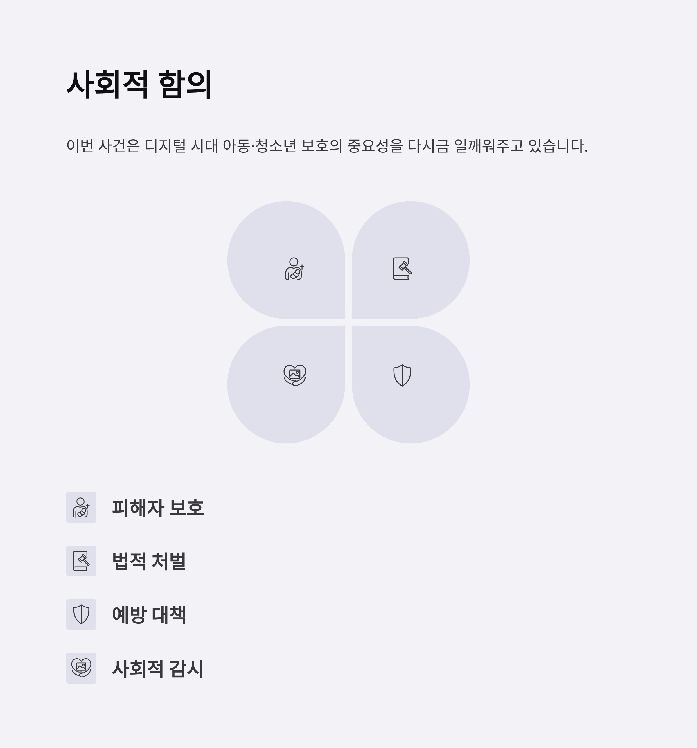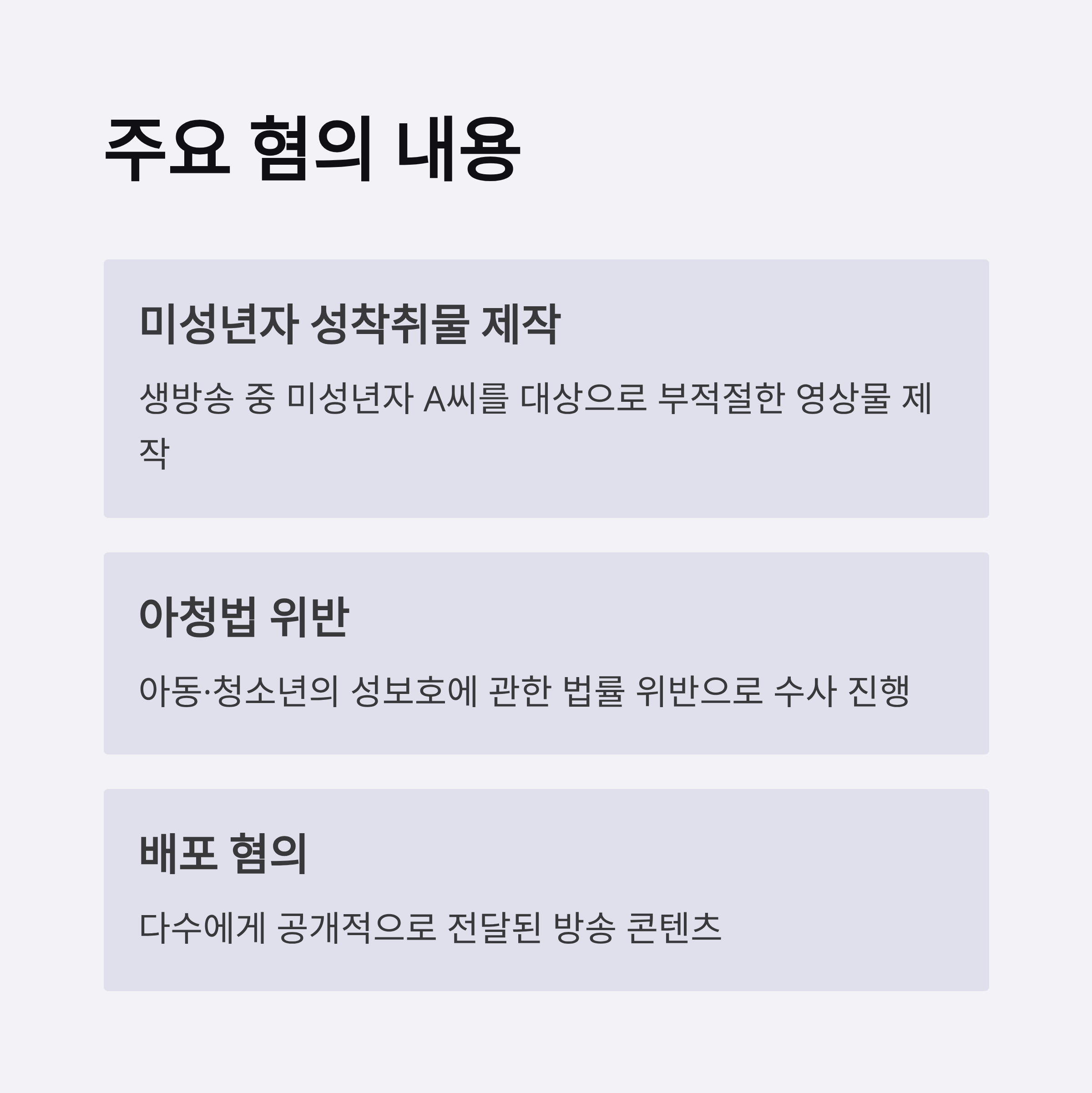 방송 당시 출연한 BJ 7명도 추가 입건되면서, 사건은 단순히 한 사람의 범죄가 아닌 조직적 참여 가능성이 논의되고 있습니다. 피해자의 권리 침해를 방치하거나 동조한 정보 유포 과정은 공범 여부를 가리는 데 중요한 역할을 할 것입니다. 해당 BJ들에게도 아동·청소년의 성보호법 위반 혐의가 적용될 가능성이 있으며, 수사 범위가 더욱 확대될 전망입니다.