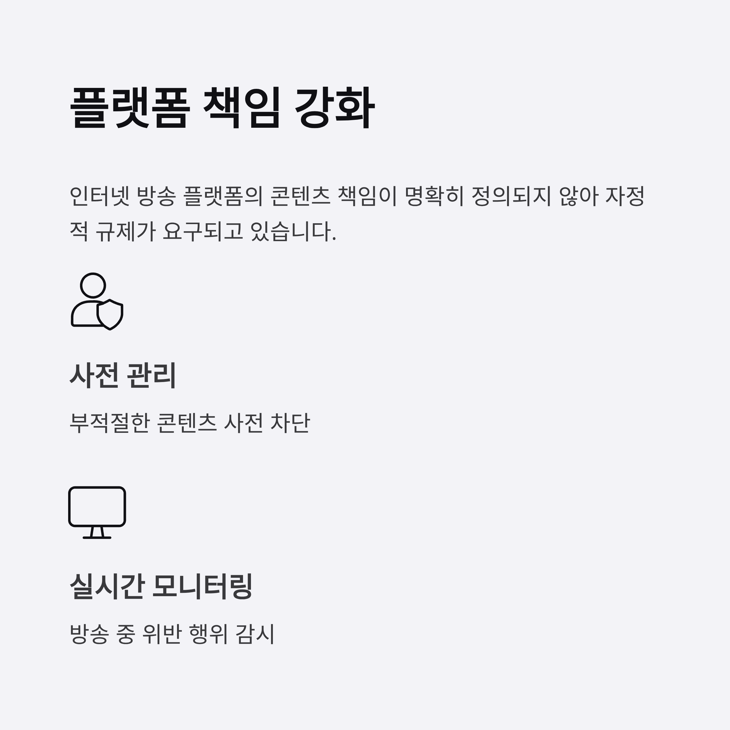 이 사건은 인터넷 방송 콘텐츠의 법적 책임 강화 문제를 대변합니다. 인터넷 방송 플랫폼은 사용자 콘텐츠에 대한 책임이 명확히 정의되지 않은 경우가 많아, 이후 플랫폼의 자정적 규제가 요구되고 있습니다. 특히 BJ의 부적절한 행동이 플랫폼의 정책 위반인지 여부도 현재 수사와는 별도로 논의되고 있습니다. 사회적 관심은 이러한 사건이 재발하지 않도록 법과 플랫폼 정책이 효과적으로 보완되어야 한다는 방향으로 모아지고 있습니다.
