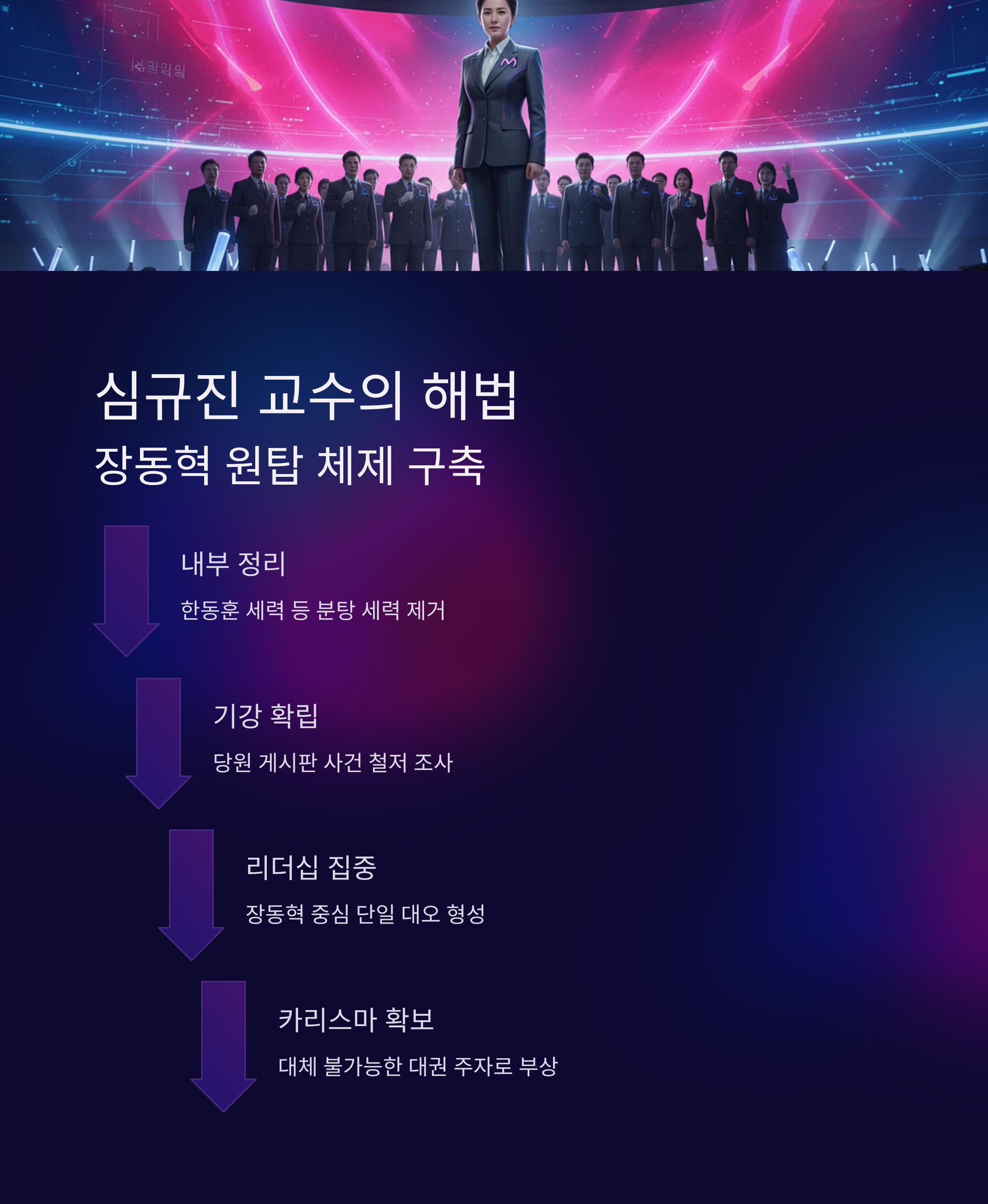 | A3. 심 교수는 '장동혁 원탑 체제'를 구축하여 리더십을 명확히 할 것을 주문합니다. 이를 위해 한동훈 세력 등 내부 분열 유발자를 과감히 정리하고 내전을 종식시켜야 하며, 장동혁 대표를 중심으로 일사불란한 팀워크를 보여주어야만 지지층 결집과 중도 확장이 가능하다고 강조합니다. |