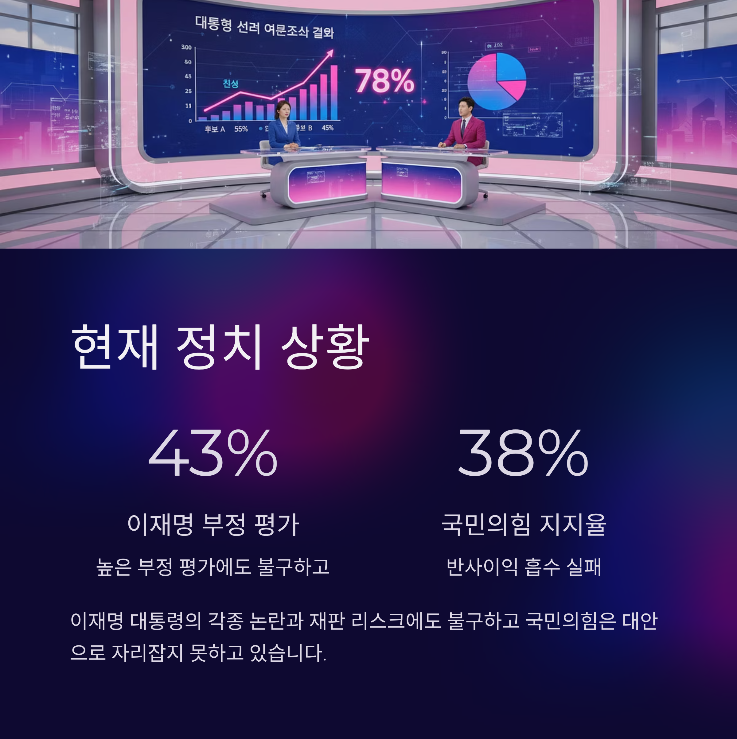 국민의힘은 현재 이재명 대통령에 대한 부정 평가층(약 43%)조차 온전히 흡수하지 못하고 38%대의 지지율에 머물러 있습니다. 이는 갤럽이나 MBS 조사보다 높은 수치임에도 불구하고, 승리를 담보하기에는 턱없이 부족한 숫자입니다. 심 교수는 그 원인을 "확실한 리더십의 부재"와 "내부 분열"에서 찾습니다. 보수층과 중도층이 보기에 국민의힘은 대안 세력으로서의 매력을 상실한 상태입니다. 이재명 대통령이 싫어서 국민의힘을 찍으려 해도, 당 내부에서 자기들끼리 싸우는 모습만 보이기 때문에 피로감을 느낀다는 것입니다.