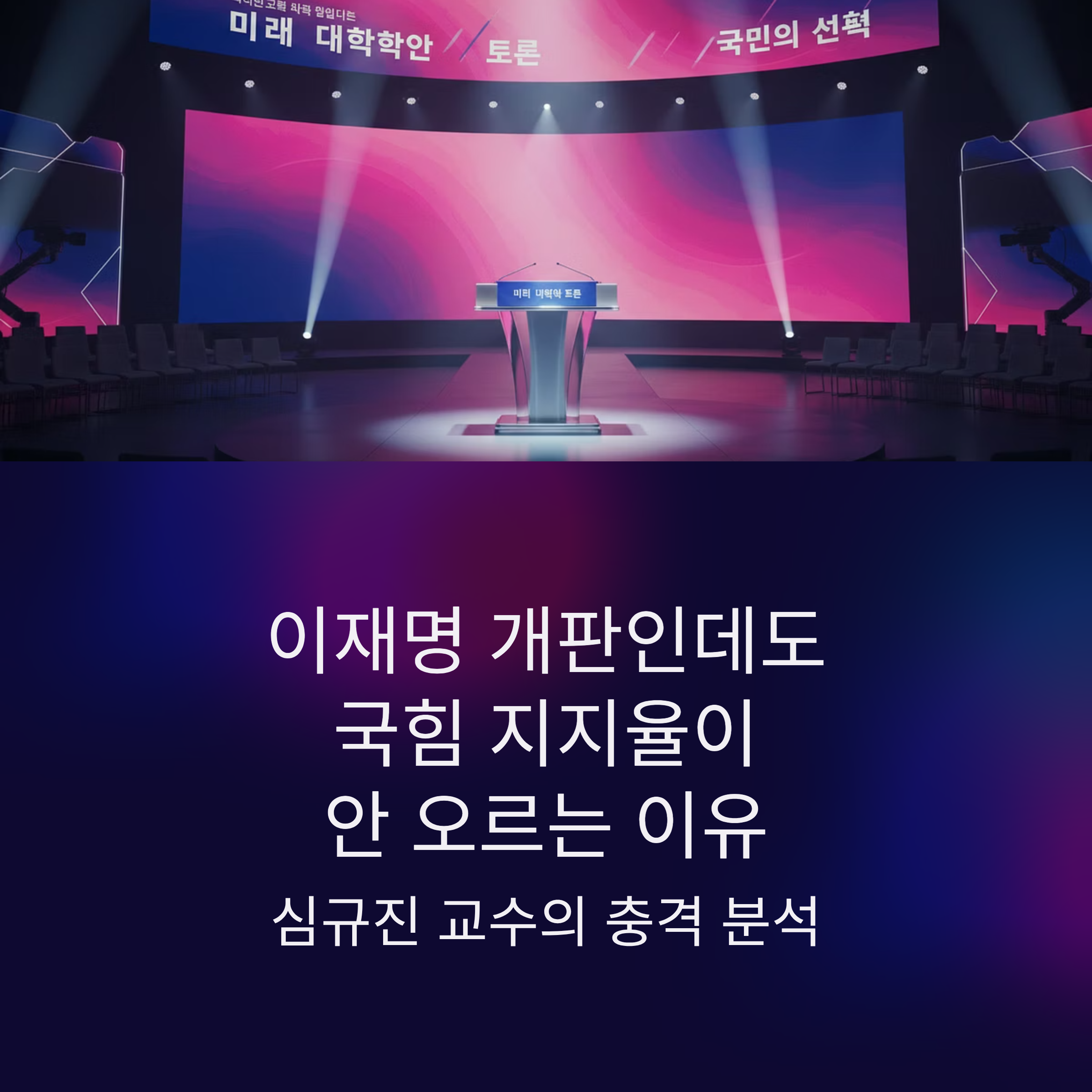 이재명 대통령의 지지율 고공 행진과 국민의힘의 고전 원인을 분석한 심규진 교수의 주장은 '효능감'과 '리더십'으로 요약됩니다. 보수 진영은 이재명 혐오에 집중하지만, 중도층은 그를 '유능한 해결사'로 인식하고 있습니다. 이를 타개하기 위해 국민의힘은 내부 투쟁을 끝내고 장동혁 대표를 중심으로 한 강력한 단일 대오를 형성해야 합니다.