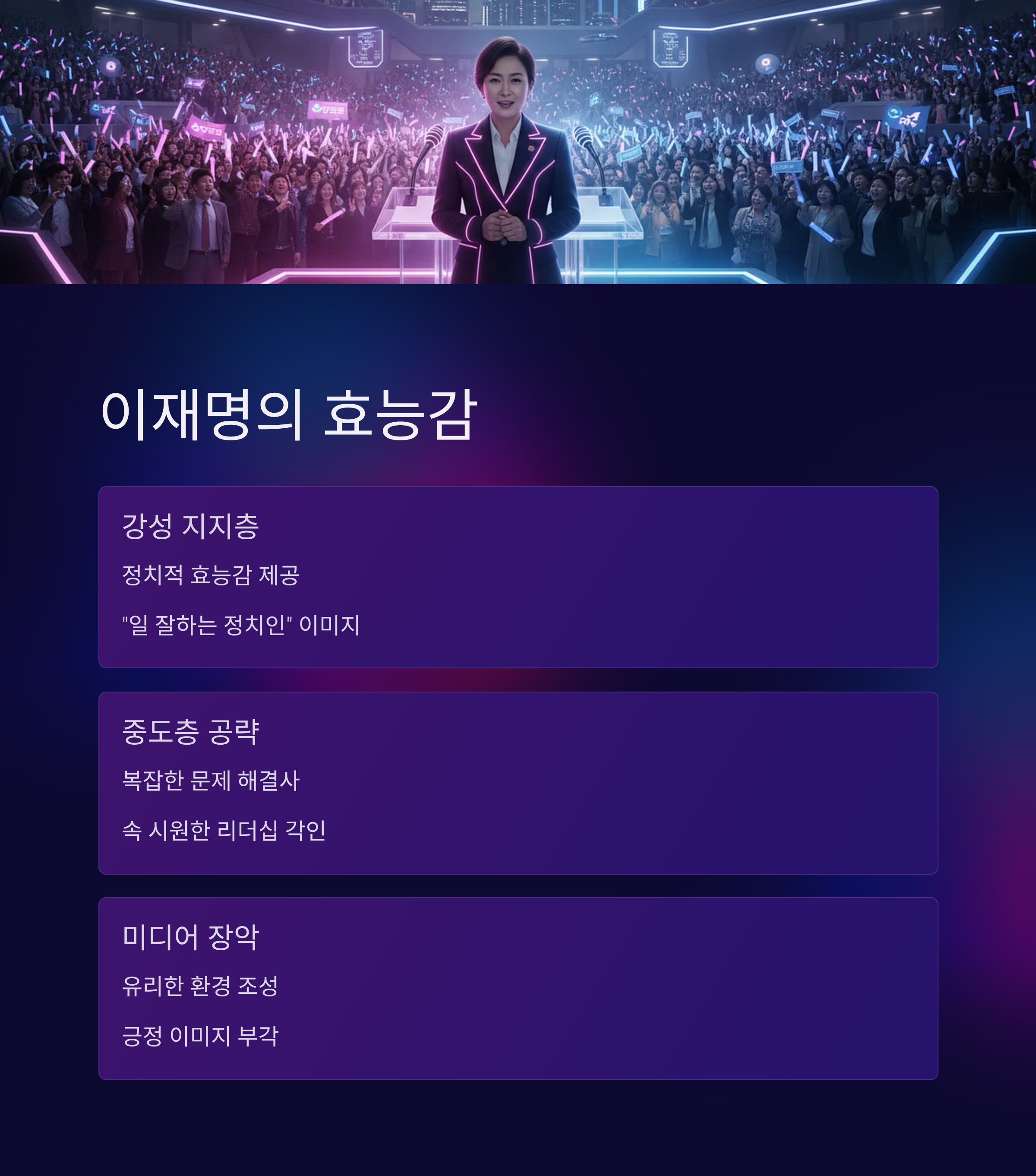 이재명의 효능감과 미디어 장악: 이재명 대통령은 강성 지지층과 중도층에게 "일 잘하고 속 시원한 정치인" 이미지를 구축하여 정치적 효능감을 인정받고 있습니다.