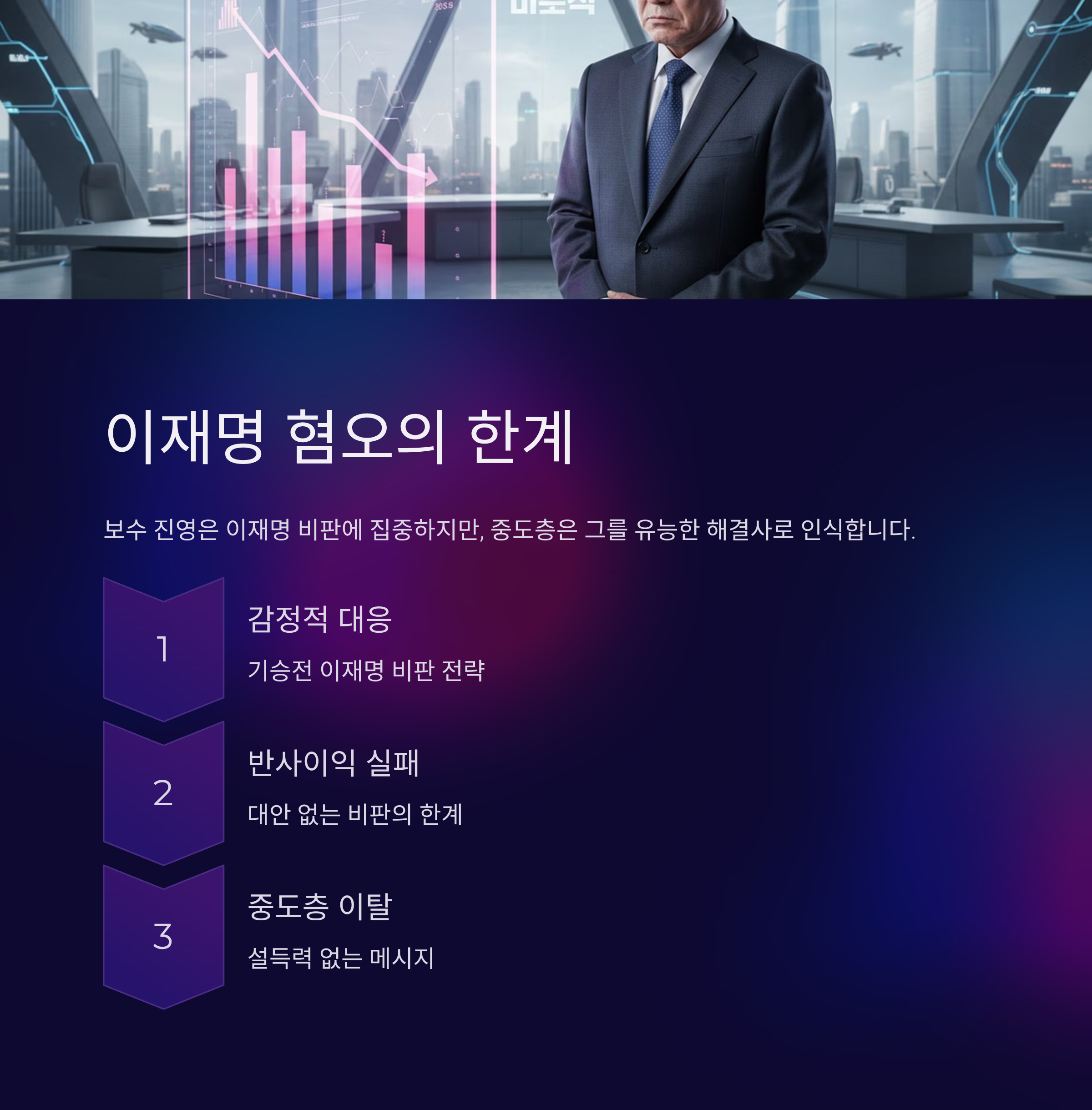 이재명 혐오의 한계: "기승전 이재명 비판"만으로는 대안이 될 수 없으며, 반사이익 전략의 실패를 의미합니다.