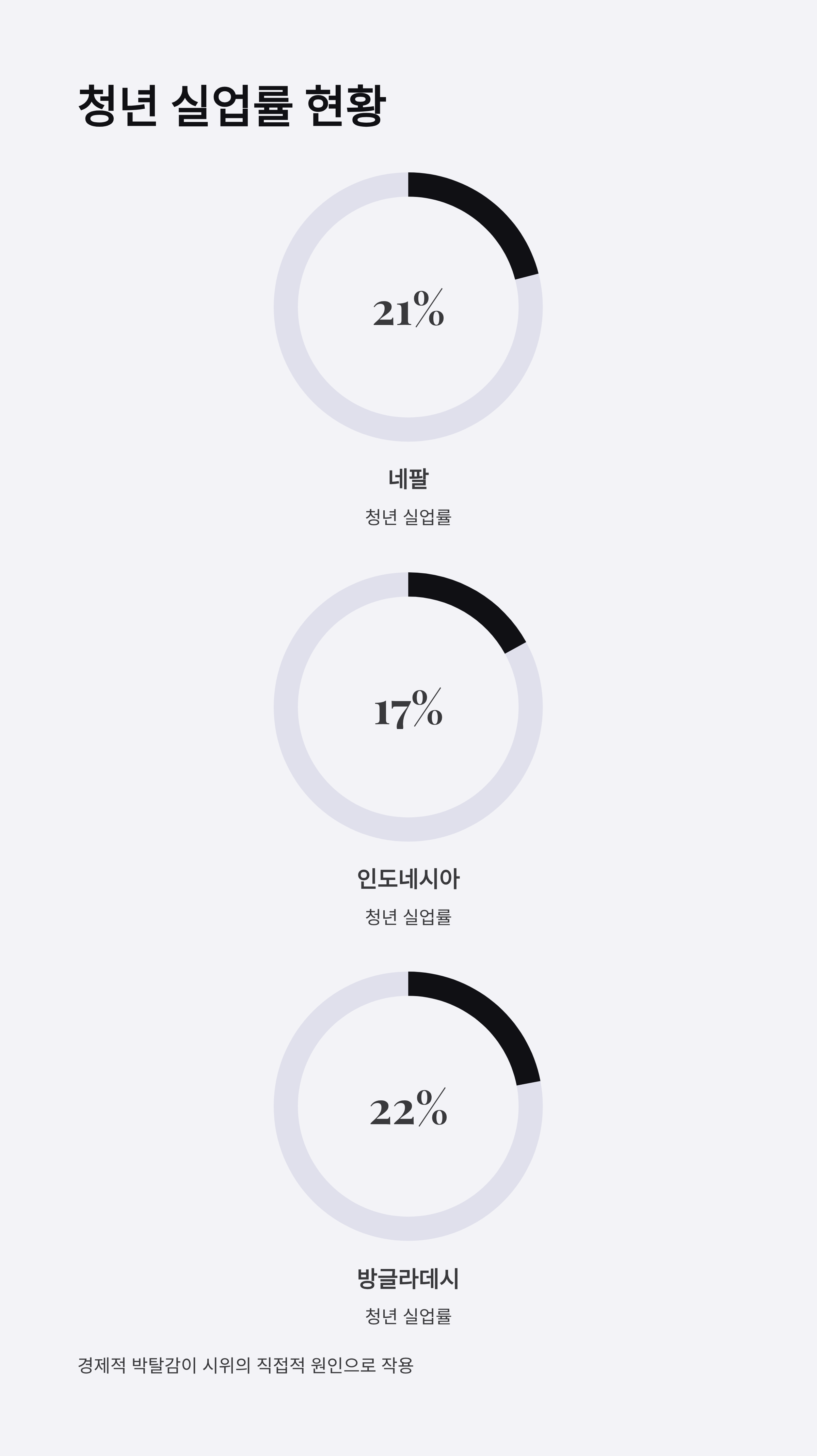 네팔, 필리핀, 인도네시아 등 아시아 주요 국가에서 청년들이 거리로 나온 핵심 원인 중 하나는 높은 청년 실업률이다. 특히 네팔에서 청년 실업률은 약 21%, 인도네시아와 방글라데시는 각각 17%, 22%로 나타났다. 이는 단순히 일자리가 없는 문제가 아니라, 교육 수준이 높아지는 상황에도 불구하고 그에 맞는 양질의 직업이 부족하다는 구조적 문제가 포함되어 있다. 이 문제는 사회적 불만을 증폭시키고, 정부의 경제 정책에 대한 신뢰도를 약화시킨다. 이들 국가는 공통적으로 노동 시장 구조의 경직성과 부패로 인해 생산성과 일자리 창출이 크게 저하되고 있다. 예를 들어, 네팔에서는 정부 주도의 경제 구조가 효율성을 저하시키는 요인으로 작용했으며, 필리핀에서는 정치권과 경제권의 결탁이 청년 의존 계층의 불만을 더욱 키웠다.