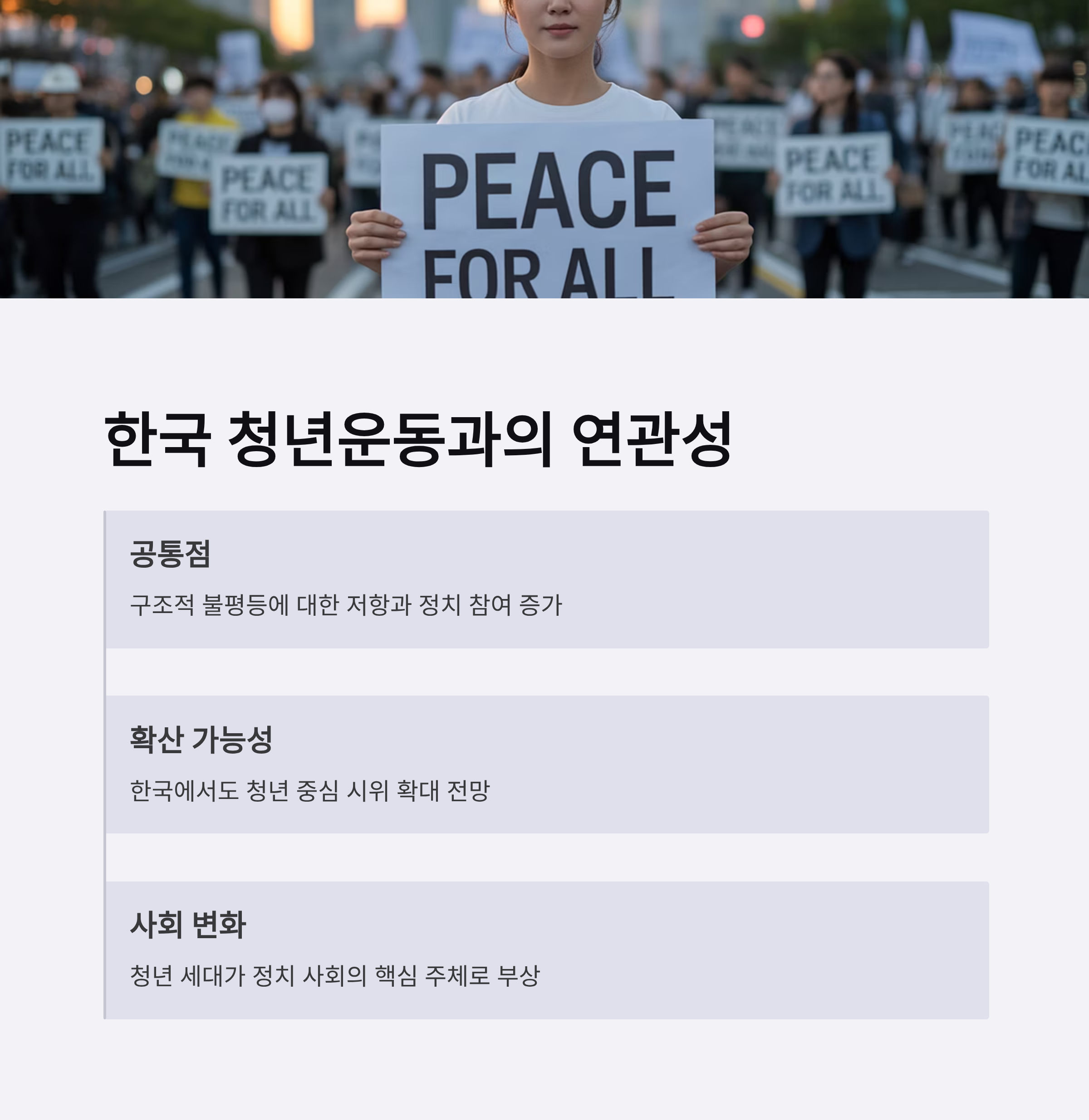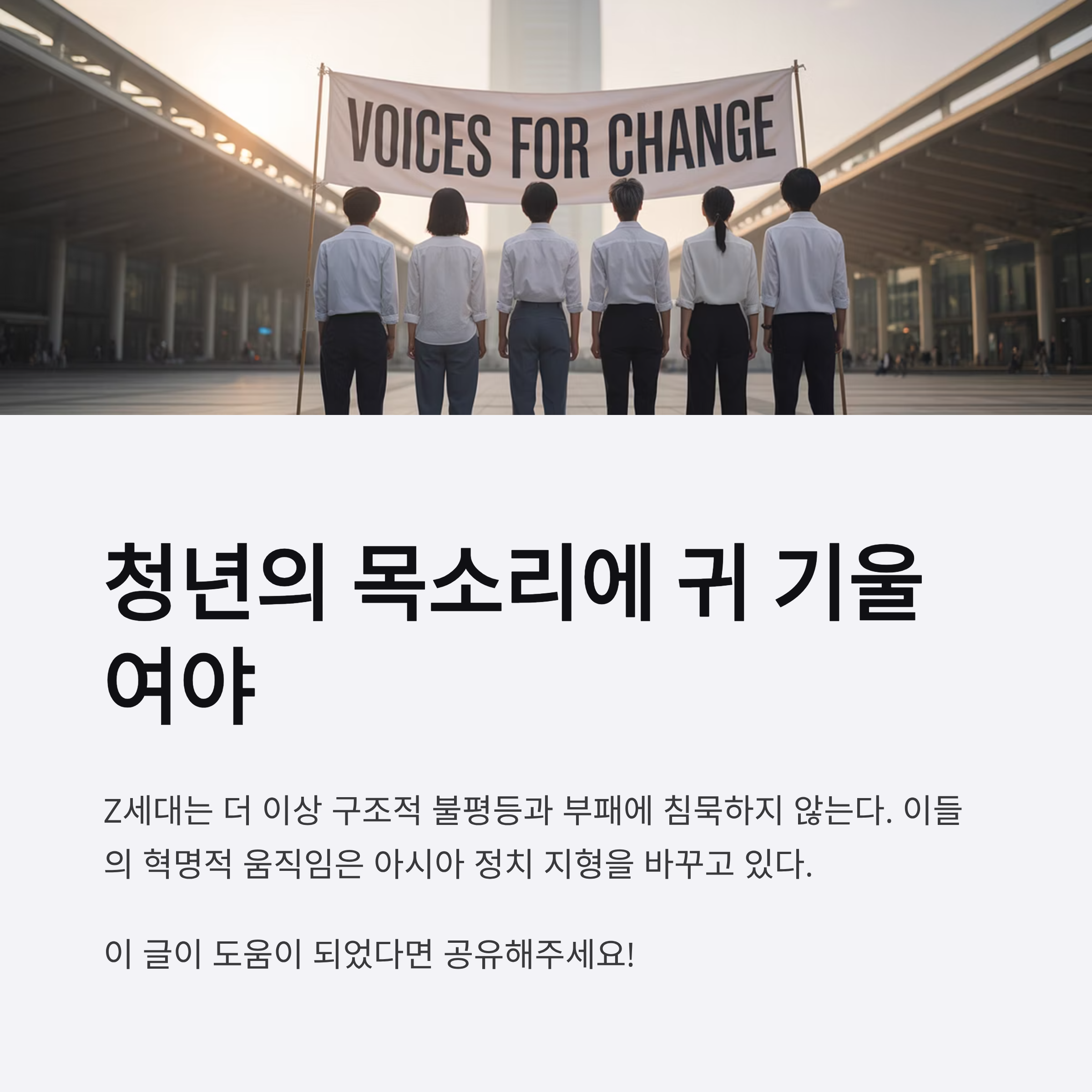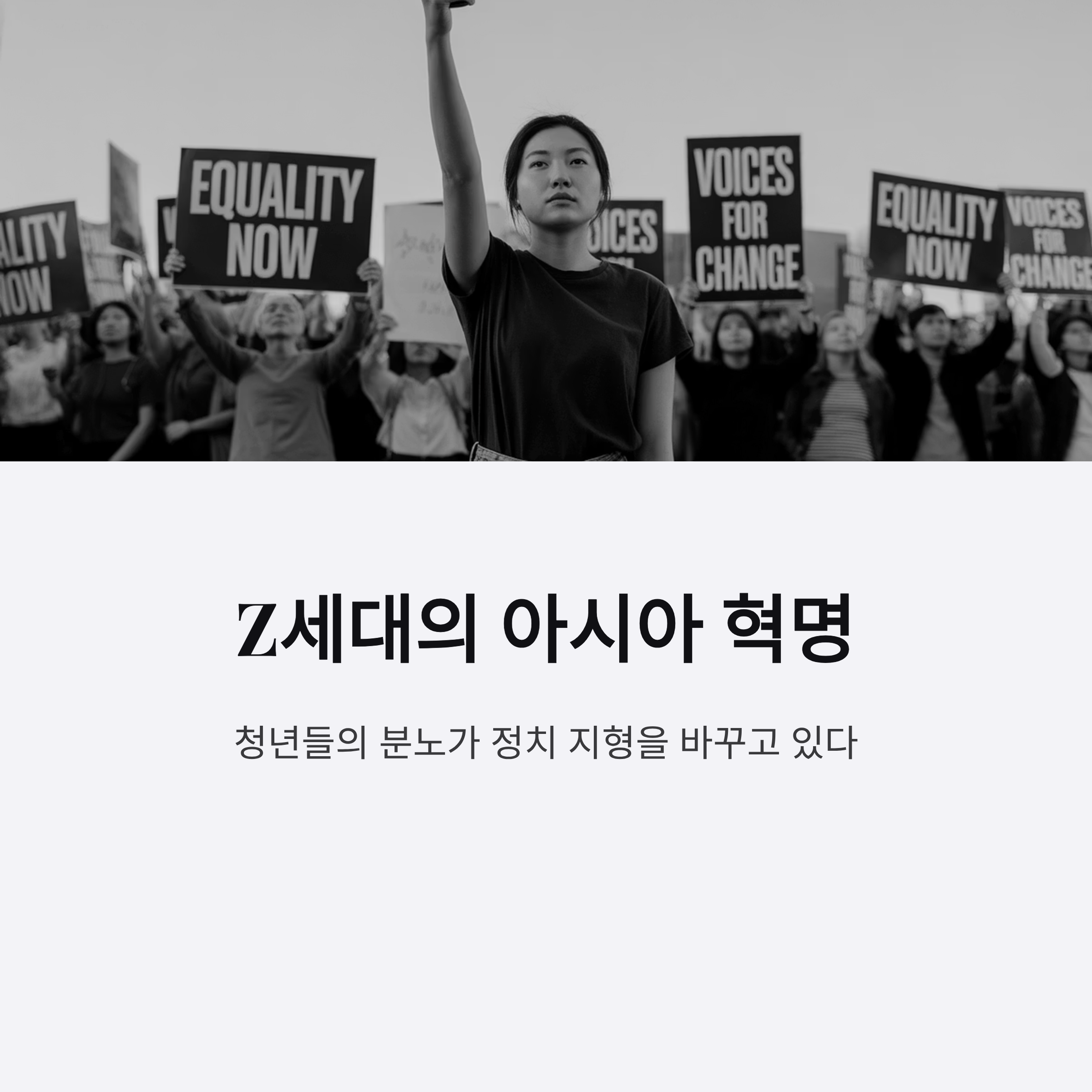 - 한국 역시 비슷한 배경 속에서 Z세대 시위의 가능성이 점쳐지고 있다.