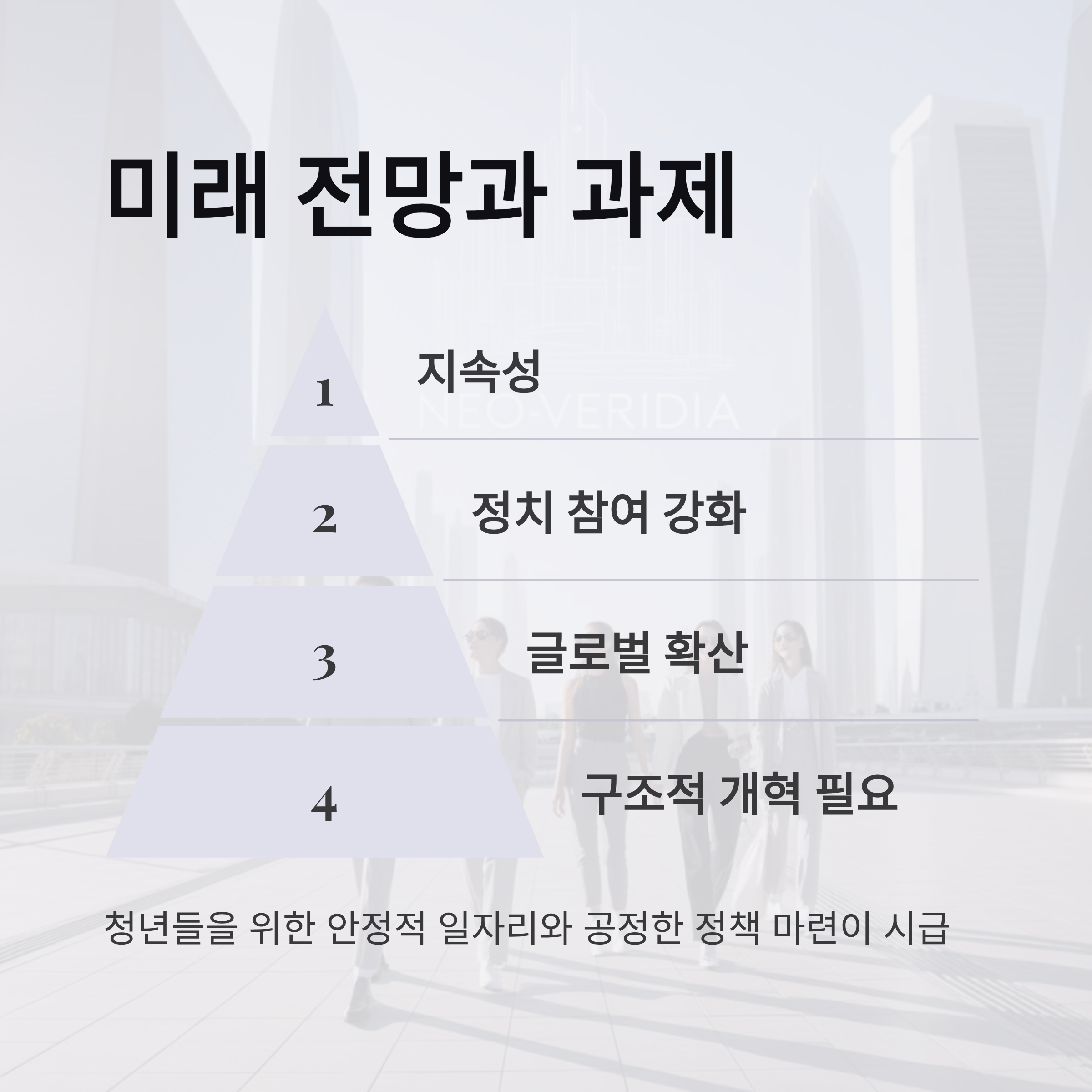 Z세대가 중심이 되어 일어나고 있는 아시아의 청년 시위는 단순히 반정부 활동에 그치지 않고 사회 구조적 문제를 해결하려는 집단적 움직임으로 발전하고 있다. NEET(취업도 교육도 하지 않는) 문제가 심화되는 가운데, 국가별로 특화된 변화가 촉진되고 있다. 한국 또한 성장과 기회 불평등, 경제적 불만이 청년 시위로 이어질 가능성을 내포하고 있다. 향후 이들이 요구하는 정치적, 사회적 변화는 단기적으로 혼란을 일으킬 수 있지만, 장기적으로는 공정성과 투명성 강화를 통해 민주주의를 한층 더 성숙시킬 기회를 제공할 것이다.