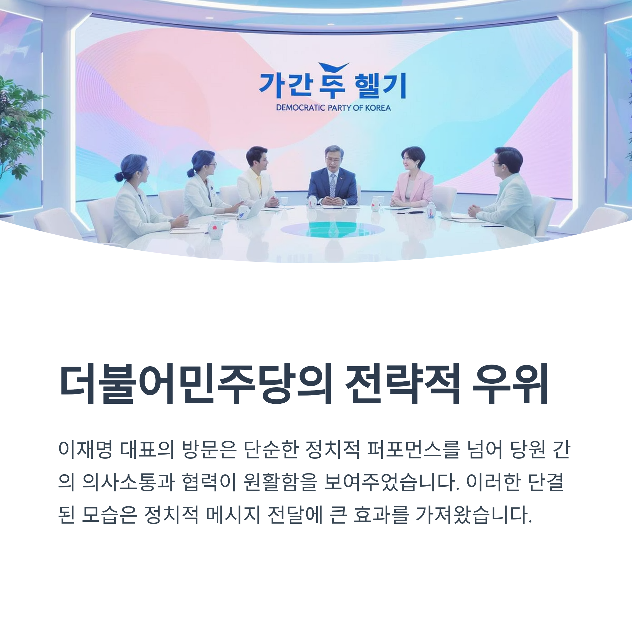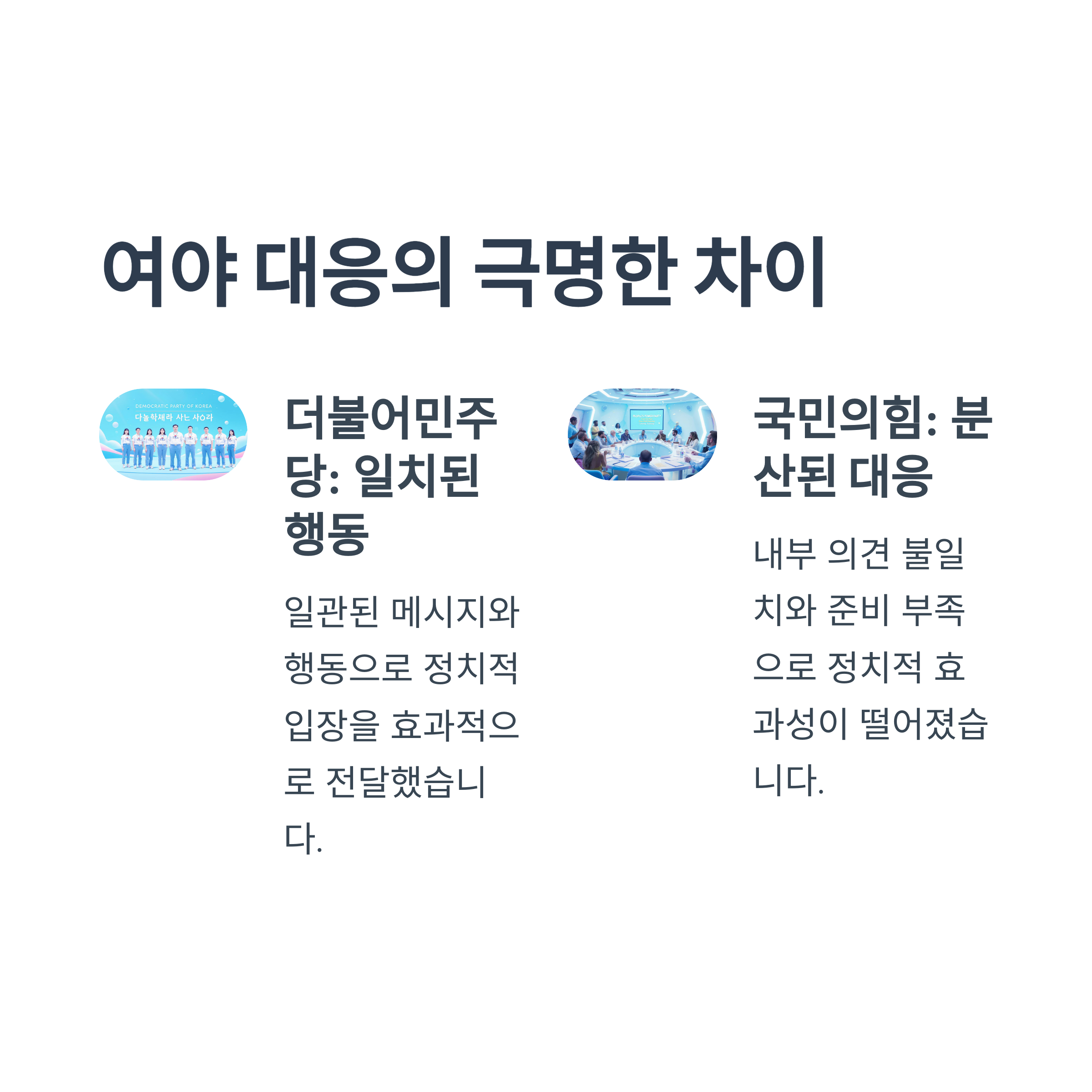 정당 내부의 응집력과 일치된 메시지는 국민 신뢰를 다시 회복하는 데 중요한 역할을 할 수 있습니다. 더불어민주당이 보여준 일관된 태도는 여당으로서 국민의힘이 반면교사로 삼아야 할 중요한 사례입니다. 지도부는 경청과 소통의 리더십을 발휘하여 무너진 결속력을 회복하고 신뢰를 강화해야 합니다.