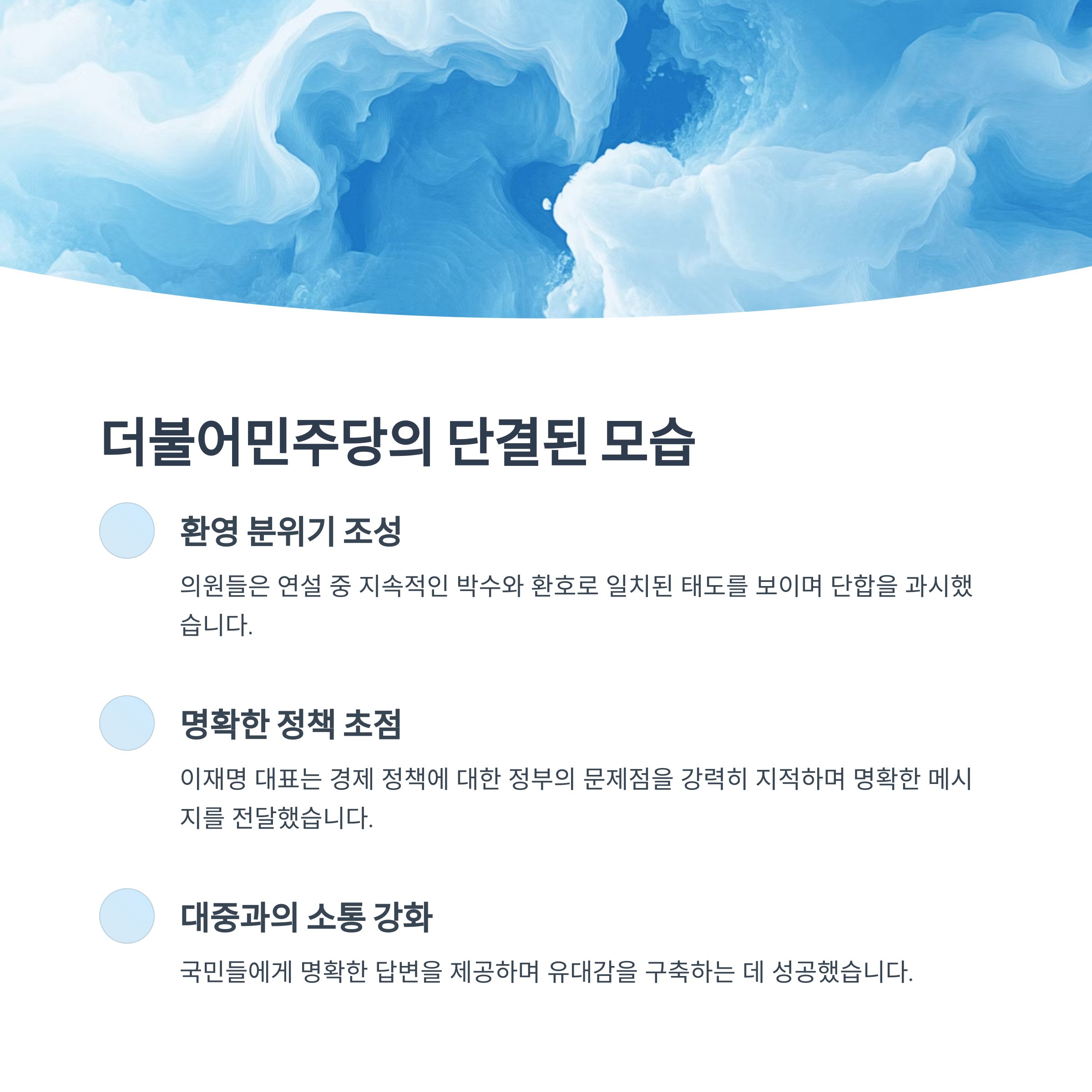 이재명 대표는 자신의 연설 내용을 통해 정부의 경제 정책과 관련된 문제를 지적하며 강력한 메시지를 전달했습니다. 이러한 내용은 민주당 의원들에게 현 정책 방향에 대한 반대 입장을 명확히 보여주었으며, 이를 계기로 연대를 강화하는 데 도움이 되었습니다. 특히 국민들에게도 명확한 답변을 제공하며, 대중과의 유대감을 구축하는 데 성공적이었다는 평가를 받고 있습니다.