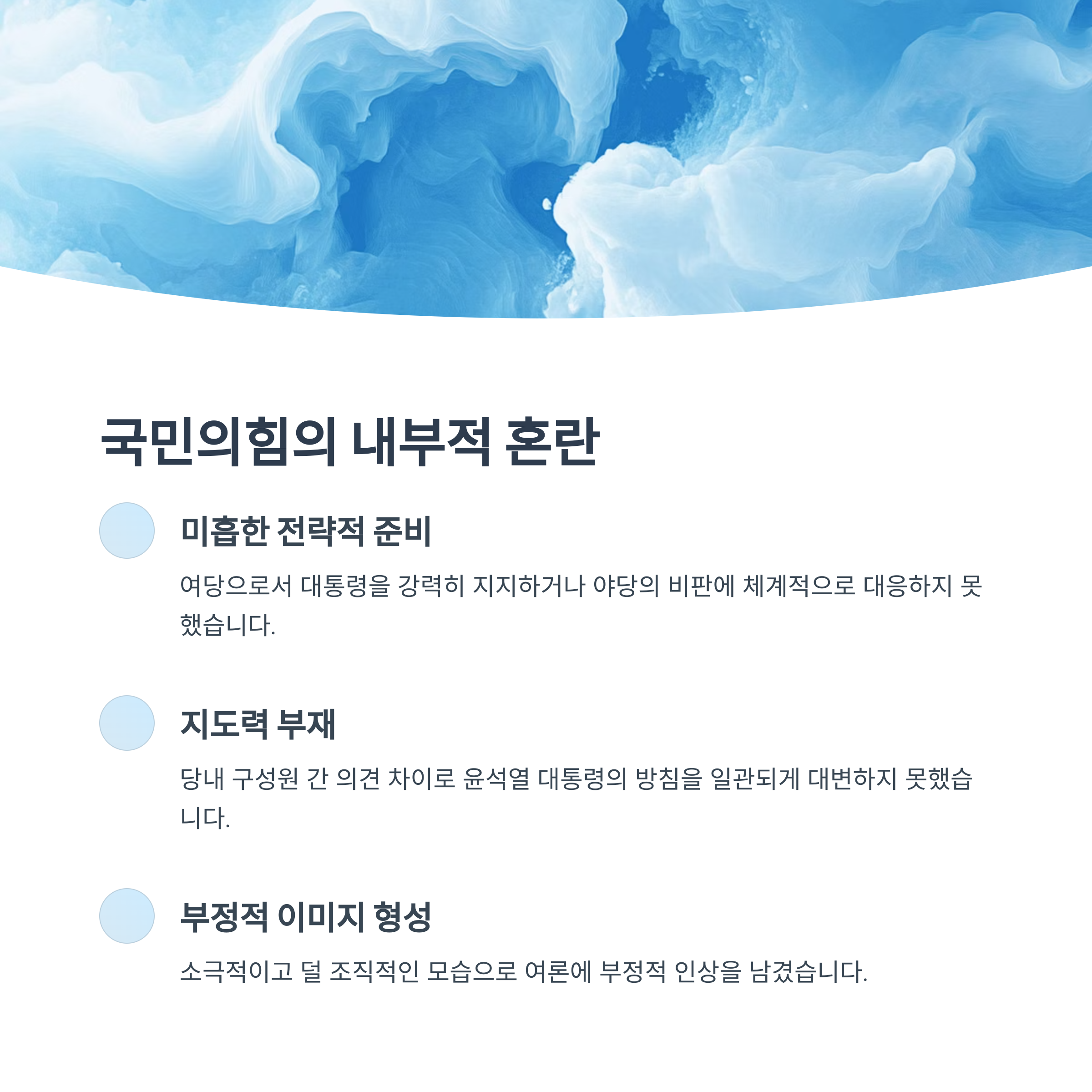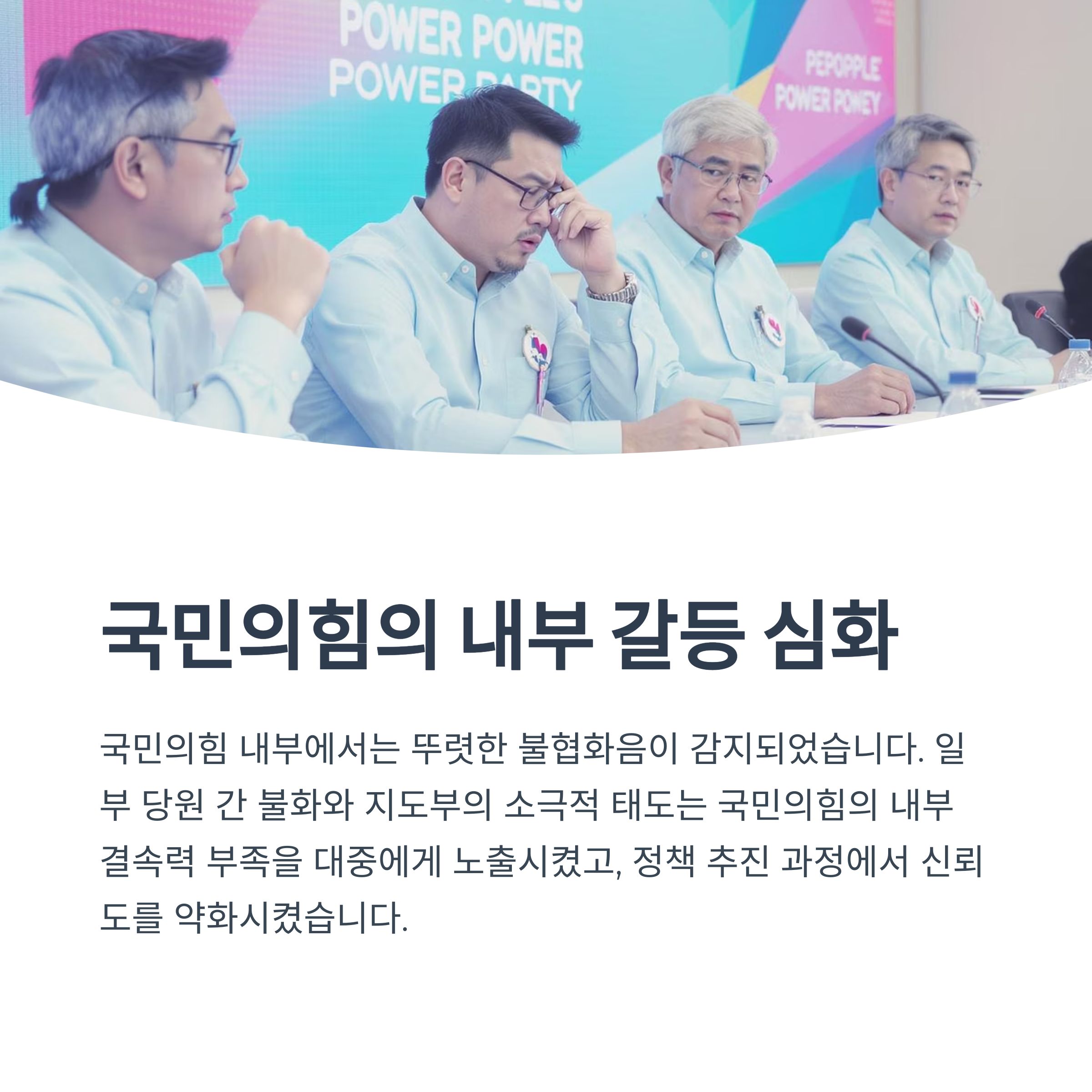 당내 구성원들 간 의견 차이는 윤석열 대통령의 방침을 일관되게 대변하지 못하는 결과를 초래했습니다. 특히 일부 당원들 간의 불화와 지도부의 소극적인 태도는 국민의힘 내부의 불협화음을 대중에게 직접적으로 드러냈습니다. 이는 주요 정책 추진 과정에서도 신뢰도를 약화시키는 요소로 작용했습니다.