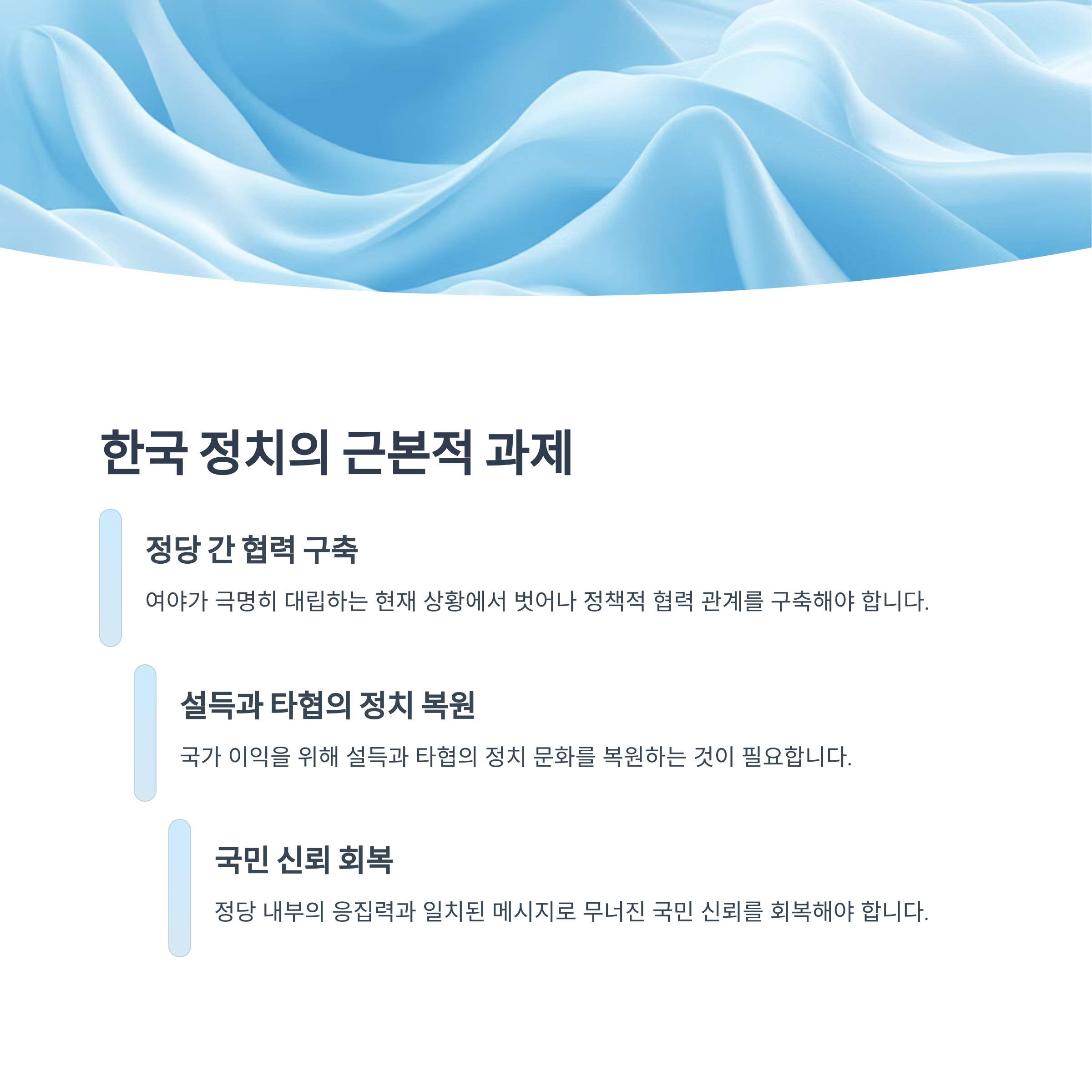 | A. 여야 간 협력과 타협을 통한 공동 발전, 정당 내부의 일관성 있는 메시지와 결속력이 필요하며, 국민과의 신뢰를 회복하는 것이 중요한 과제가 될 것입니다. |