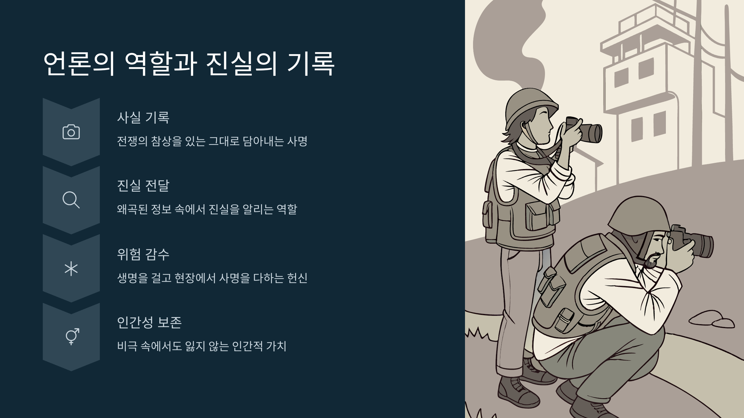 주인공은 기자들이다. 그들은 총알이 오가는 전장을 누비며 ‘왜 이 나라가 이렇게 되었는가’를 기록한다. 이 모습은 지금 한국에서 벌어지는 정치, 언론, 사회 분열과도 닮아 있다. 우리는 지금 어떤 시대를 지나고 있는가? 그리고 과연 민주주의는, 우리가 믿는 그 모습 그대로 남아 있을까?