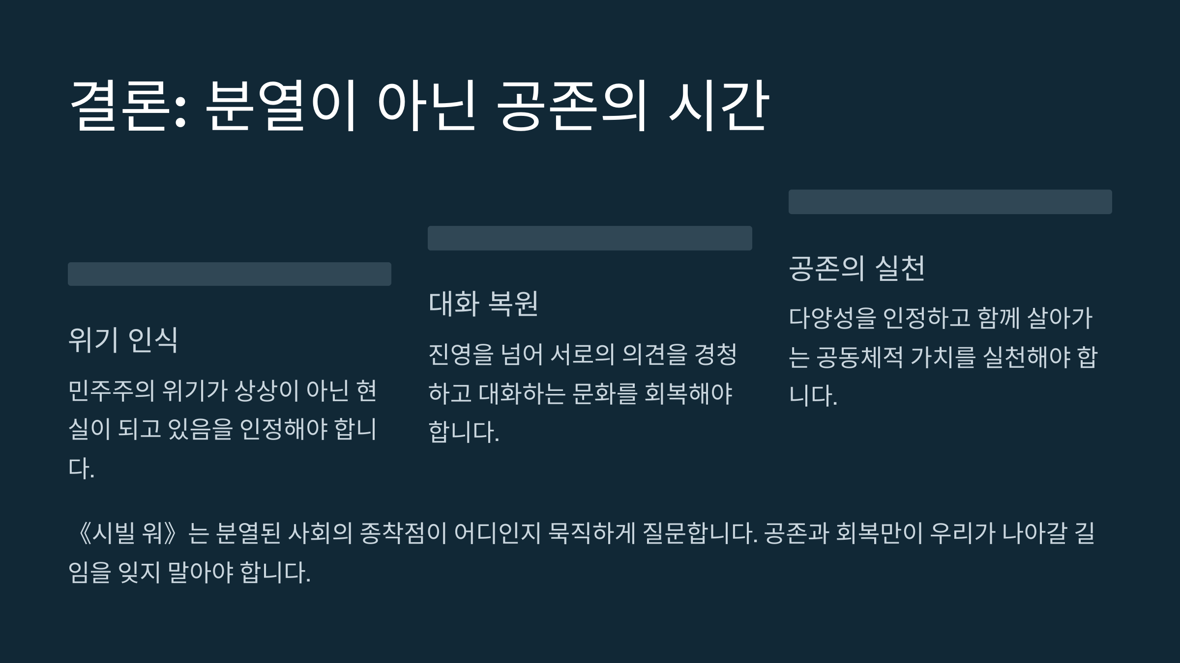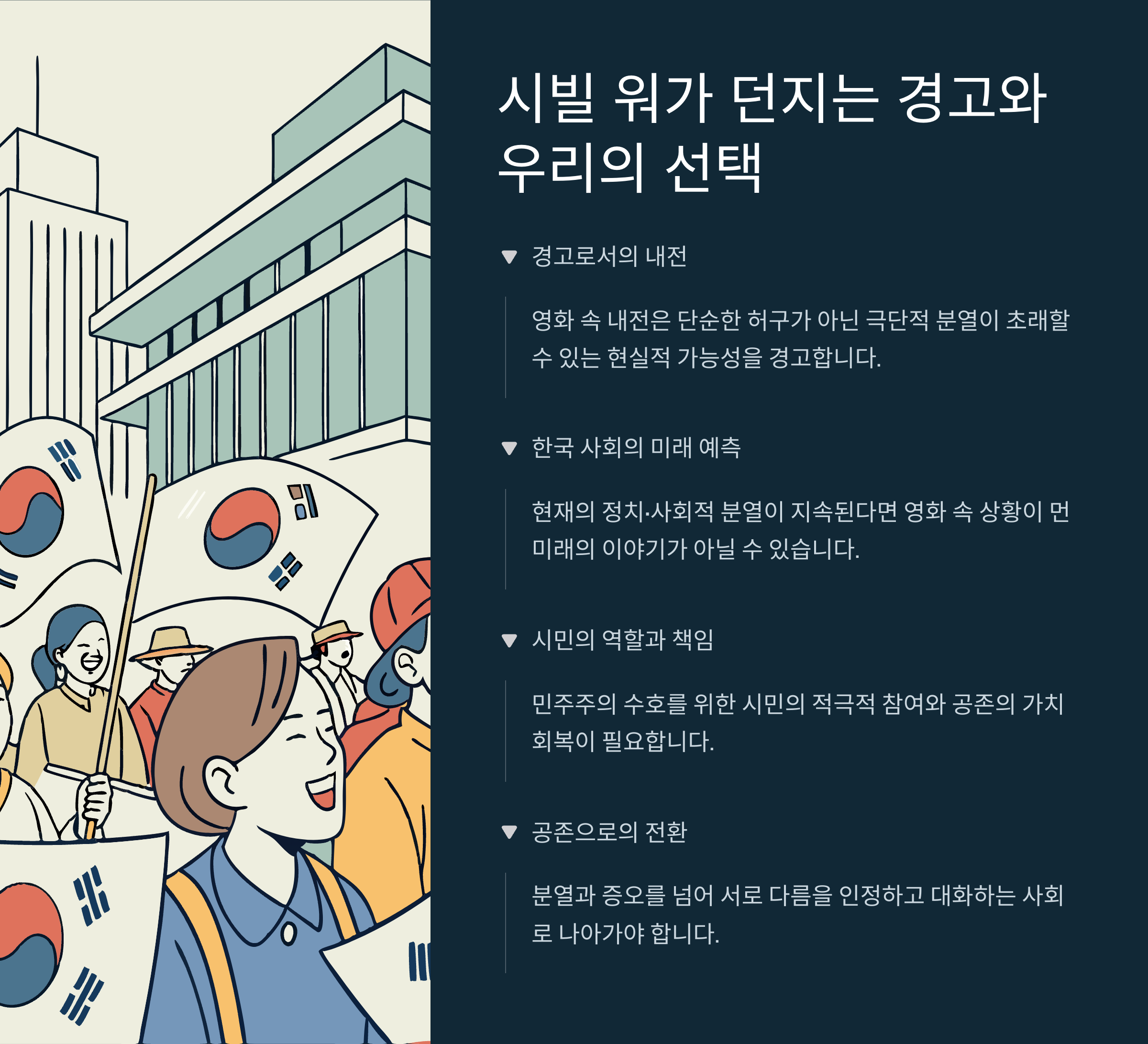 《시빌 워》는 시민이 ‘무관심’하거나 ‘한쪽 진영의 대변인’이 될 때, 사회가 얼마나 빠르게 무너지는지를 보여줍니다. 한국도 시민의 비판적 사고, 언론 감시, 정치 참여 없이는 더 큰 분열을 피할 수 없습니다. 우리 민주주의가 계속 유지되기 위해선 국민 개개인의 역할이 그 어느 때보다 중요합니다.