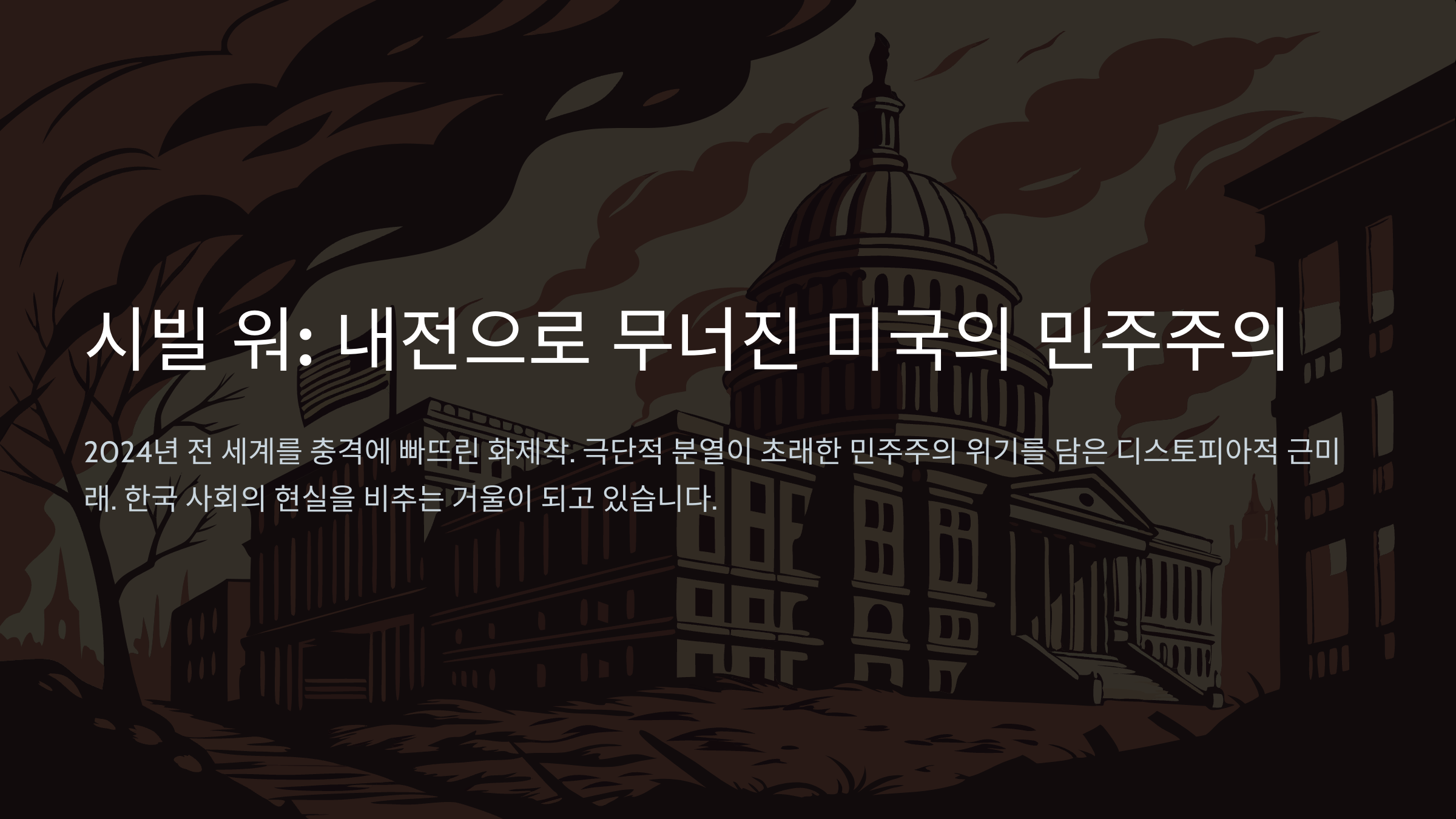 2024년, 전 세계 관객에게 충격을 안긴 영화 《시빌 워 (Civil War)》. 격화된 미국의 내전을 배경으로 한 이 영화는 단순한 상상이 아니다. 극단으로 치달은 정치 양극화, 언론의 역할, 민주주의의 위기라는 주제를 통해 오히려 지금의 한국 사회를 비추는 거울이 되고 있다.