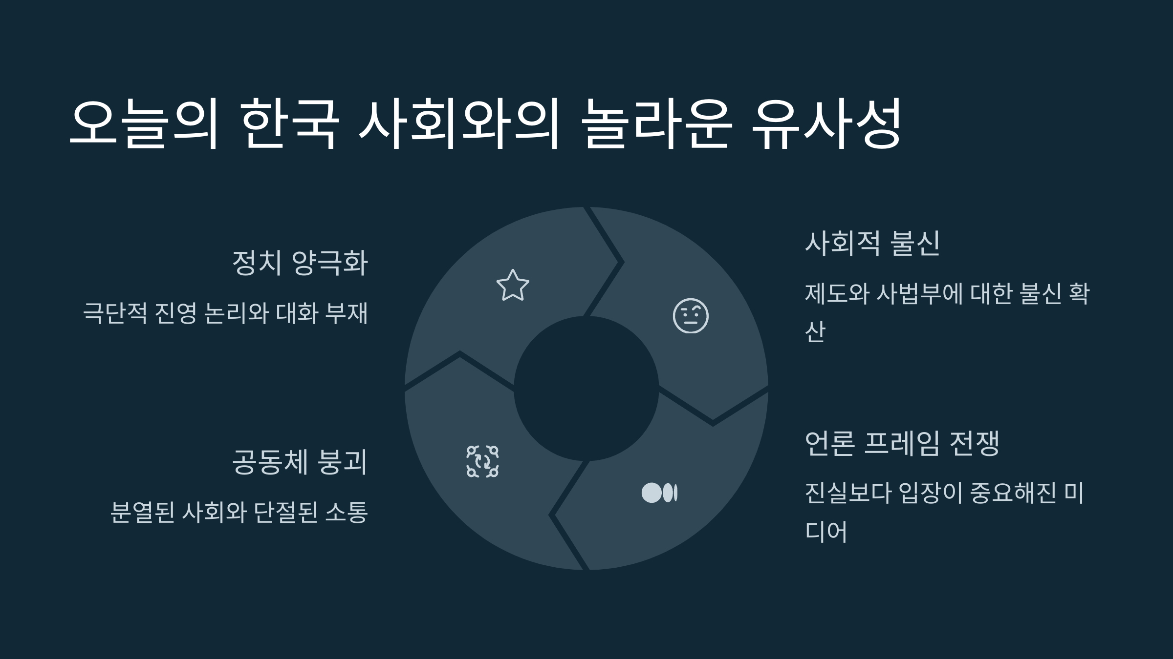 정치 양극화, 언론 불신, 시민 간 갈등 등 여러 요소에서 구조적 유사성이 존재합니다. 영화는 이를 극대화해 경고합니다.