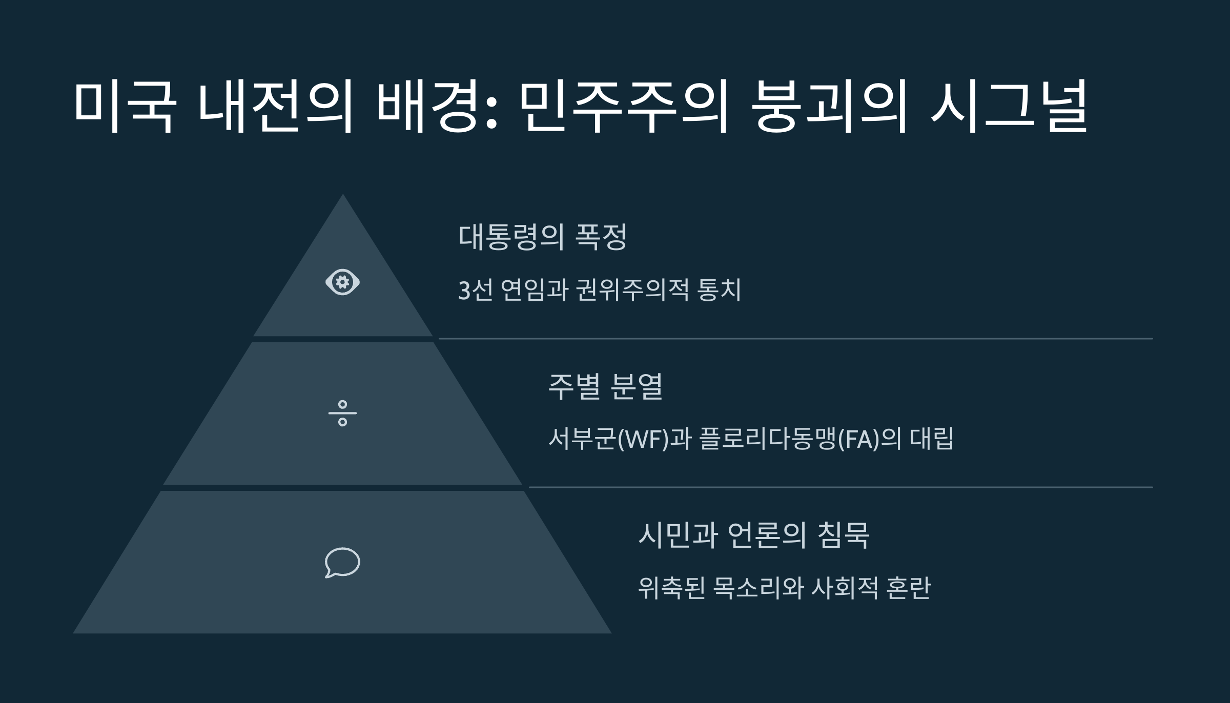 | 정치 | 장기집권 대통령, 연방 분열 | 극단적 양극화, 국정 교착 |