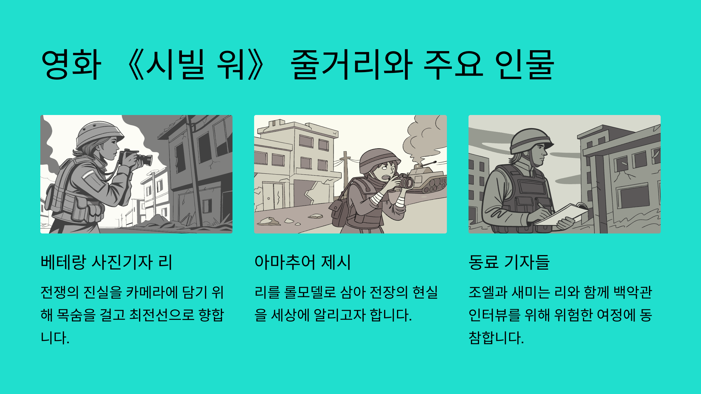 《시빌 워》는 내전이 일어난 미국을 배경으로, 진실을 기록하려는 기자들의 시선을 통해 민주주의가 무너지는 과정을 보여준다. 대통령의 장기 집권, 언론 통제, 분열된 시민 사회는 영화 속 이야기지만, 현재 한국 정치·사회 환경과도 놀라운 유사성을 보인다.