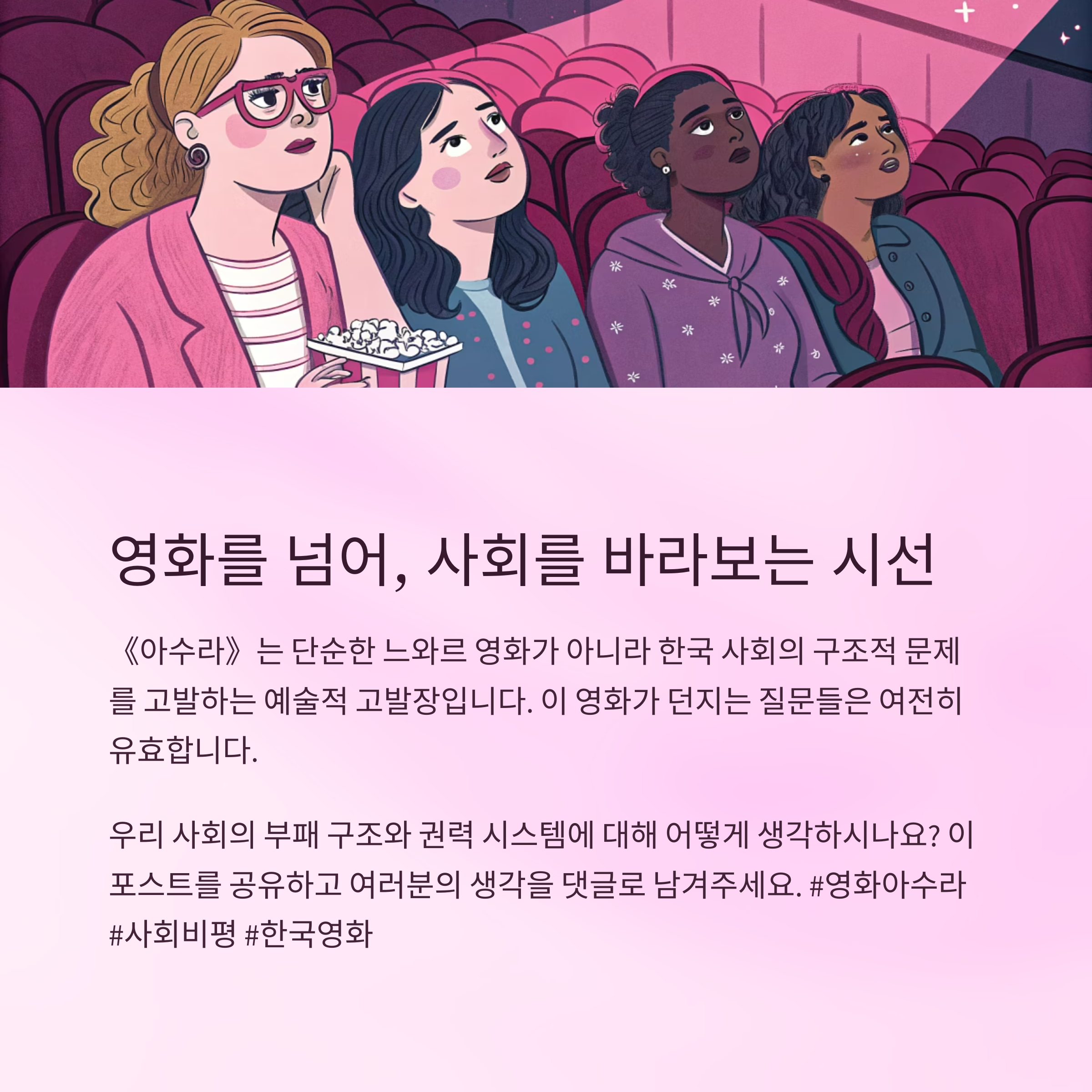 영화는 특정 개인의 악행이 아닌, **시스템 자체가 썩어 있는 구조적 문제**를 폭로합니다. 법과 언론, 공권력이 권력자에게 복무하는 모습은 많은 관객들에게 실제 현실을 연상시킵니다. 결국 《아수라》는 단순한 느와르가 아닌, **한국 사회의 어두운 거울**로 기능하며 사회적 공감대를 형성했습니다.