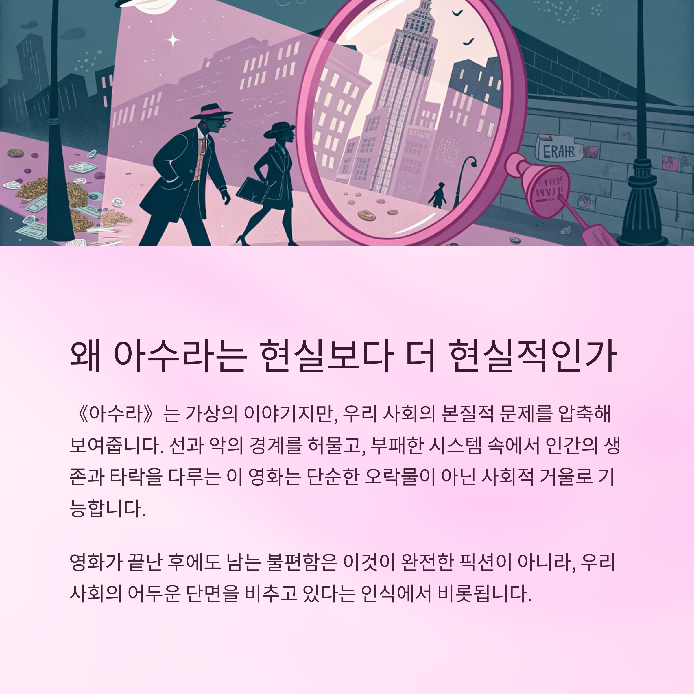 《아수라》는 한국 사회의 어두운 민낯을 적나라하게 보여주는 영화입니다. 이 작품이 단순히 느와르 장르를 넘어서는 이유는, 그 안에 담긴 메시지가 **현실과 기묘하게 일치하기 때문**입니다. 시장 하나의 타락이 아닌, 시스템 전체가 공범이 되어가는 과정은 관객으로 하여금 공포보다 더한 씁쓸함을 남깁니다.