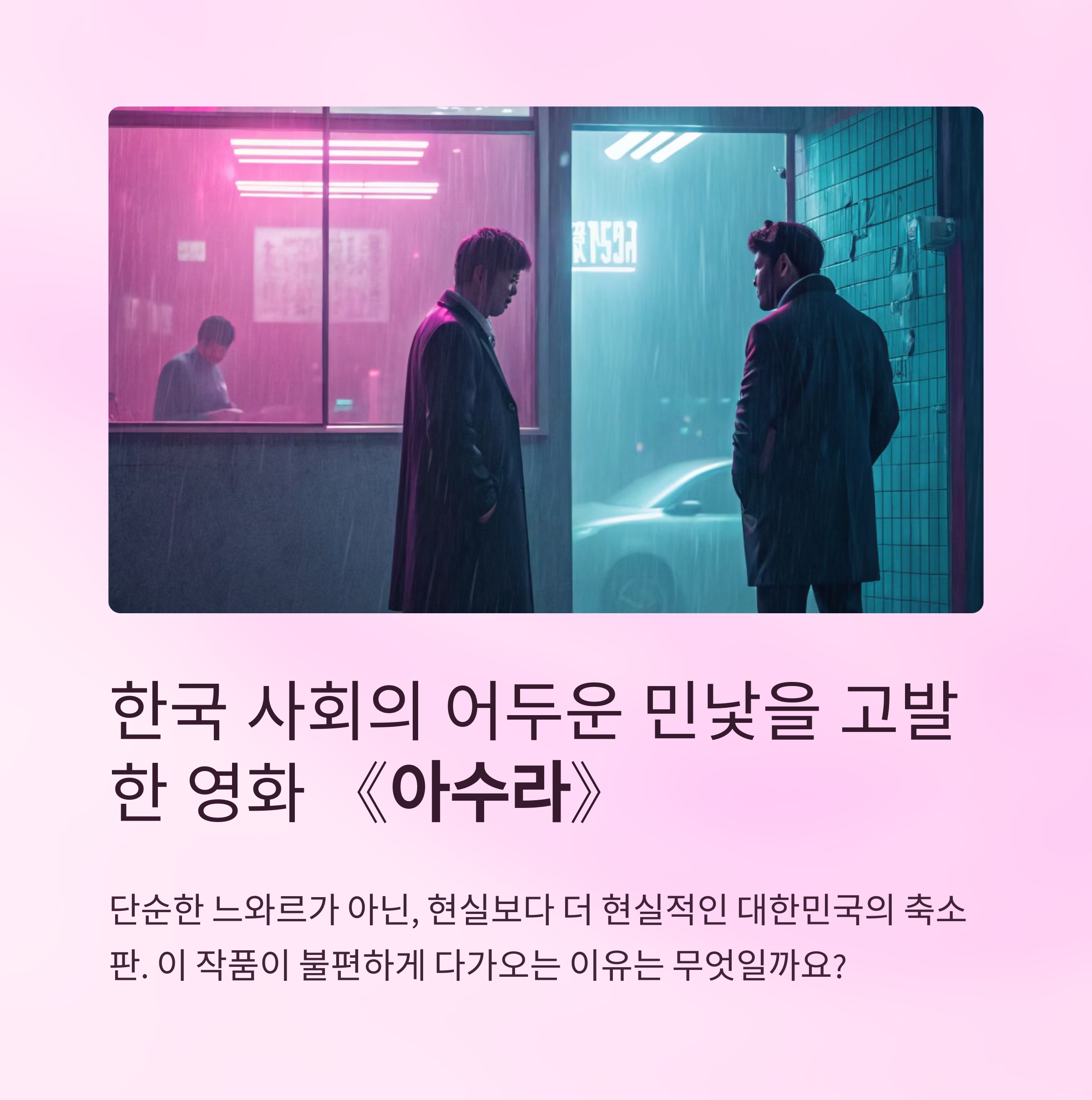‘아수라’란 제목은 불교에서 분노와 투쟁의 세계를 뜻합니다. 이 영화에서 지옥은 어디 멀리 있는 공간이 아니라, 지금 이 순간 우리가 살고 있는 **한국 사회의 축소판**입니다. 끊임없는 경쟁, 억압, 권력의 불균형 속에서 평범한 사람들도 괴물이 되어버리는 현실. 그것이 바로 《아수라》가 주는 가장 깊은 불편함이자 통찰입니다.