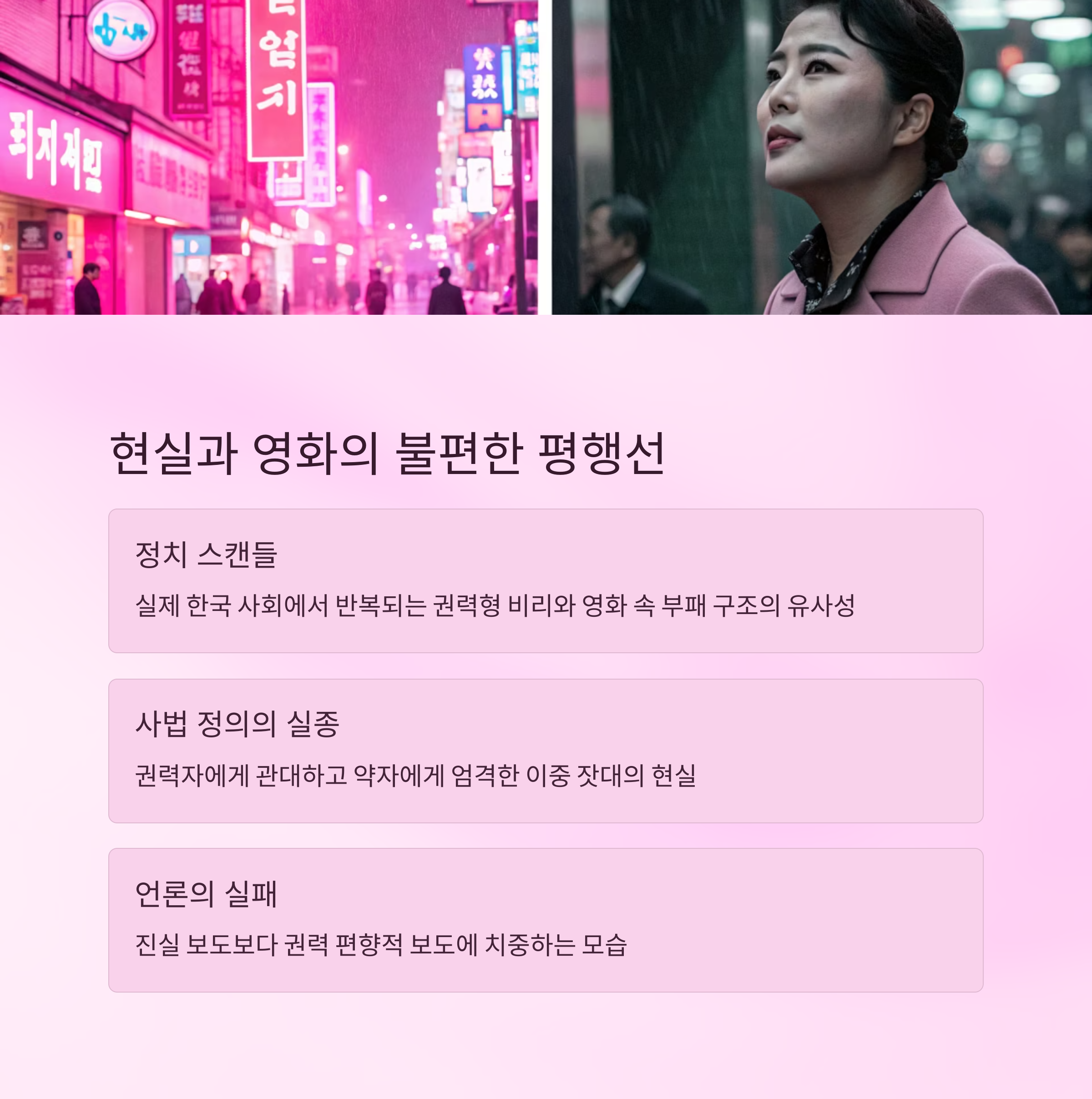 ‘안남시’에서는 시장만 나쁜 것이 아닙니다. 경찰, 검찰, 심지어 기자들까지 권력자에게 복무합니다. 이는 현실에서 발생한 정경유착, 검찰의 봐주기 수사, 언론 플레이 등과 매우 닮아 있습니다. 영화는 이들을 하나의 공범 구조로 묘사하며, 시스템 자체가 이미 **도덕적 기능을 상실**했다고 말합니다.