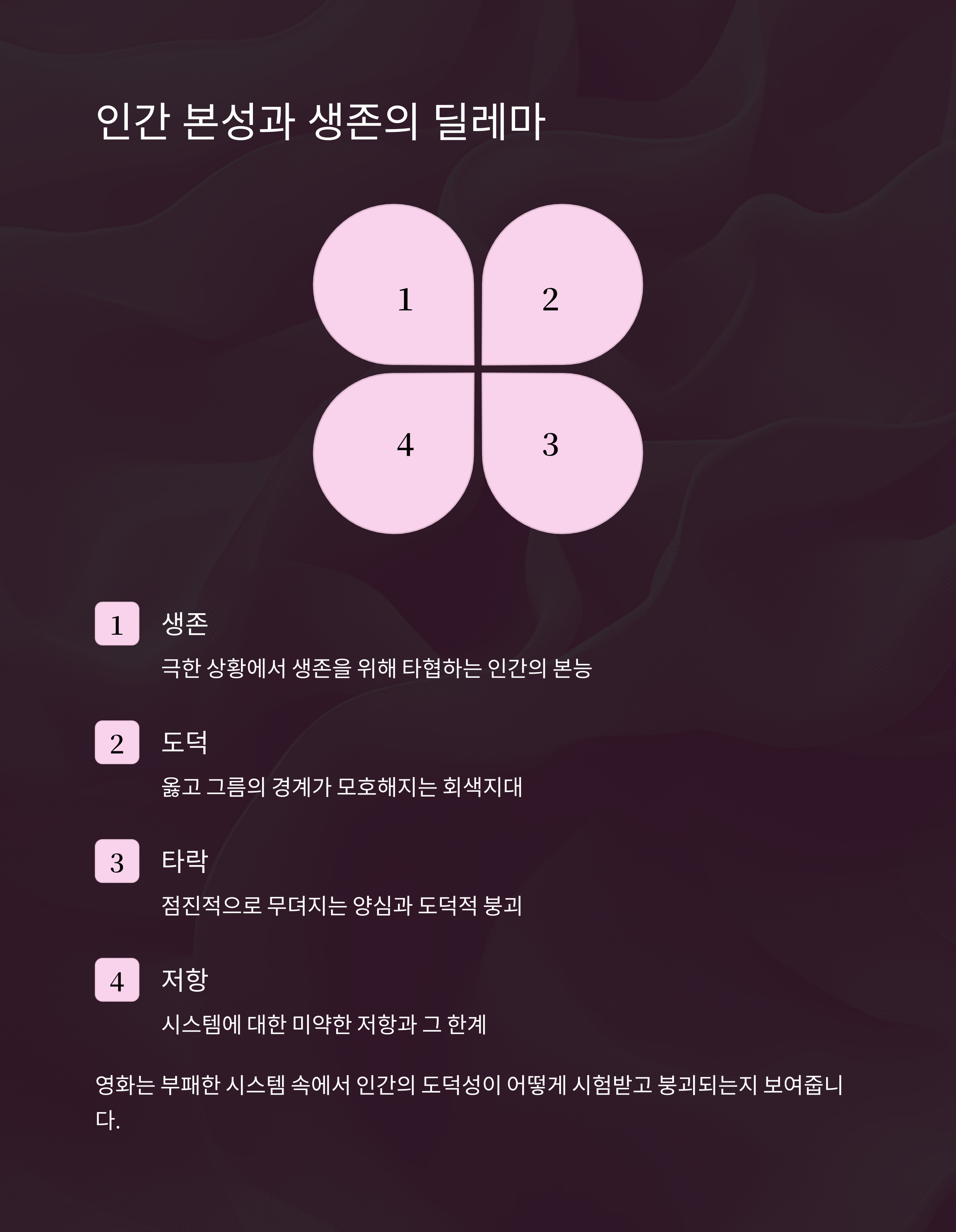 영화 속 인물들은 처음부터 악한 존재가 아닙니다. 생존의 공포, 가족의 생계, 구조적 억압 속에서 점점 윤리를 버리게 됩니다. 특히 한도경의 타락 과정은 관객에게 **도덕적 회색지대의 현실**을 떠올리게 만듭니다.