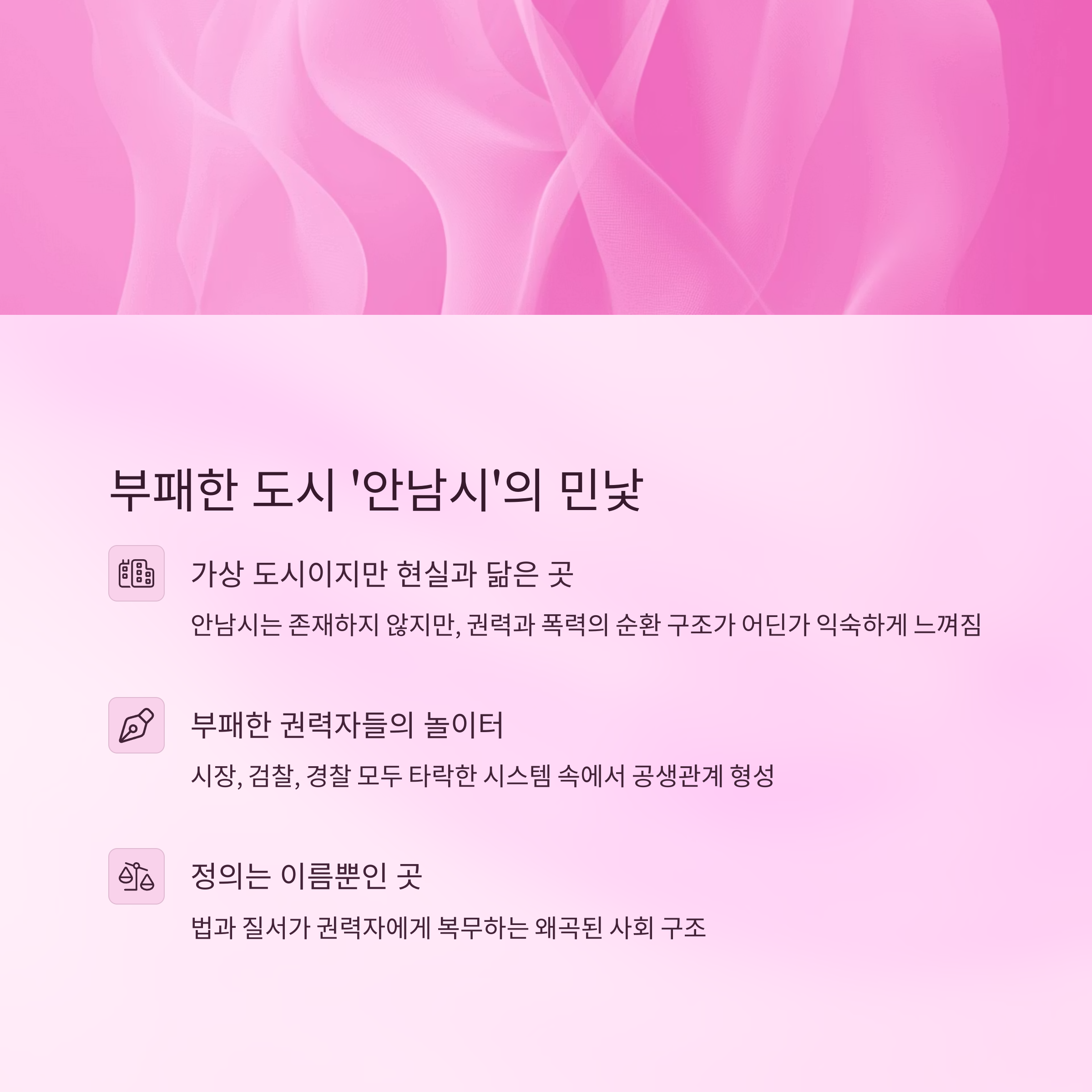 극 중 배경이 되는 가상의 도시 ‘안남시’는 실제 존재하지 않지만, 관객은 어딘가 익숙하다고 느낍니다. 시장, 검사, 경찰, 형사 모두가 부패에 물들어 있고, 정의는 이름뿐인 공간. 이 영화는 "우리 사회도 이와 다를 바 있는가?"라는 불편한 질문을 던지며, 타락의 순환 속에 놓인 대한민국의 일면을 비추고 있습니다.